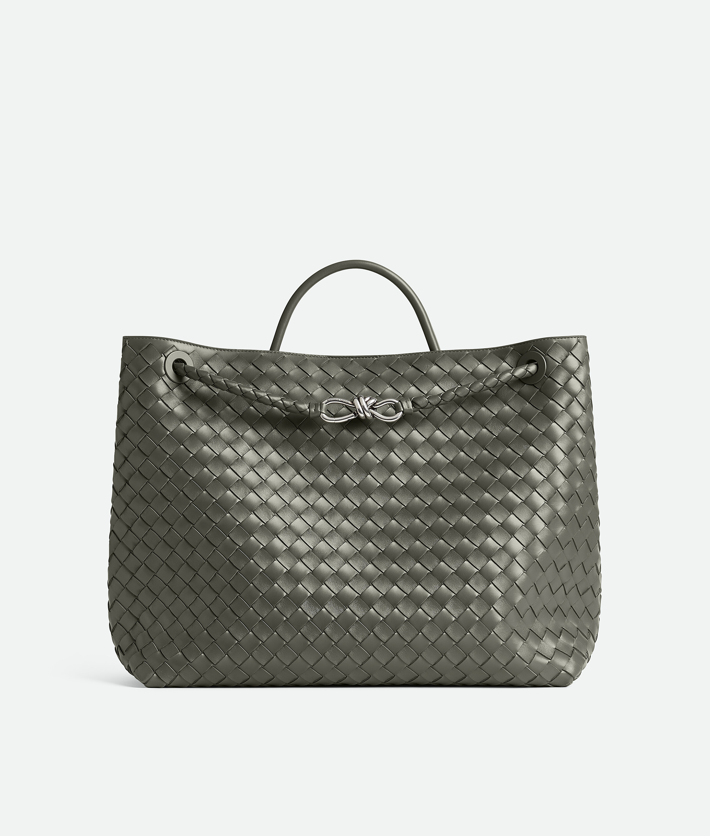 Top handle bag in supple Intrecciato leather with signature knot detail and sliding cross-body strap.