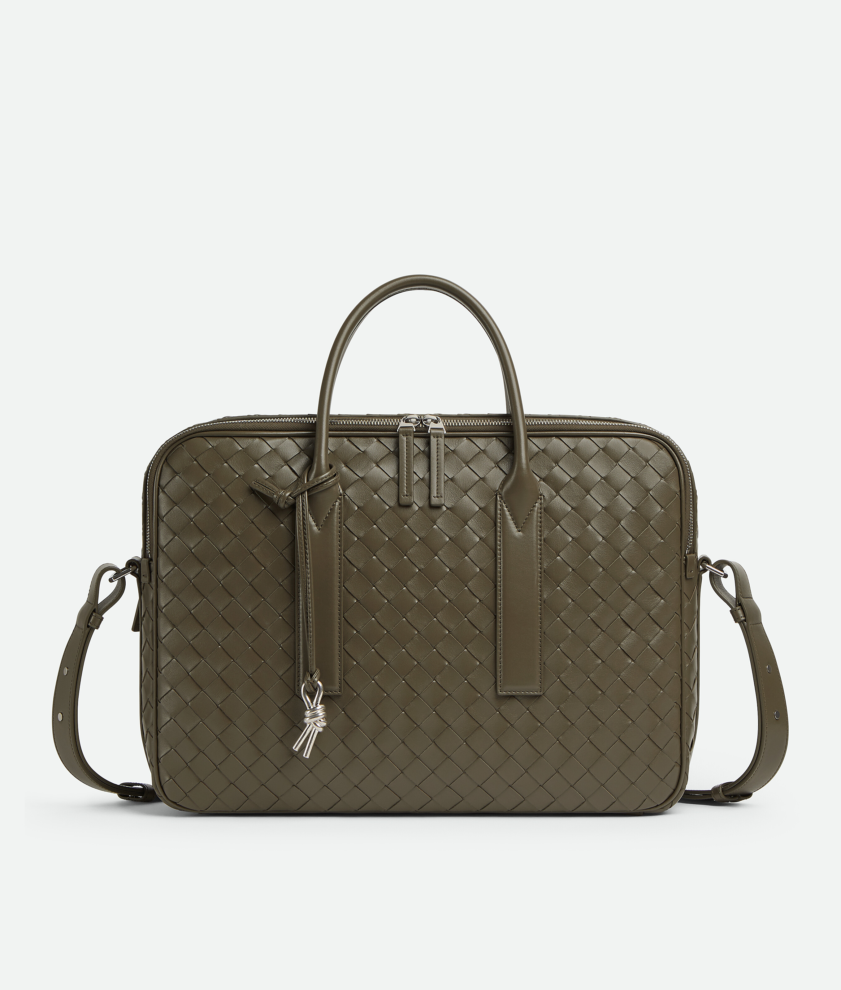 Briefcase in soft Intrecciato leather with adjustable and detachable strap and signature knot detail.