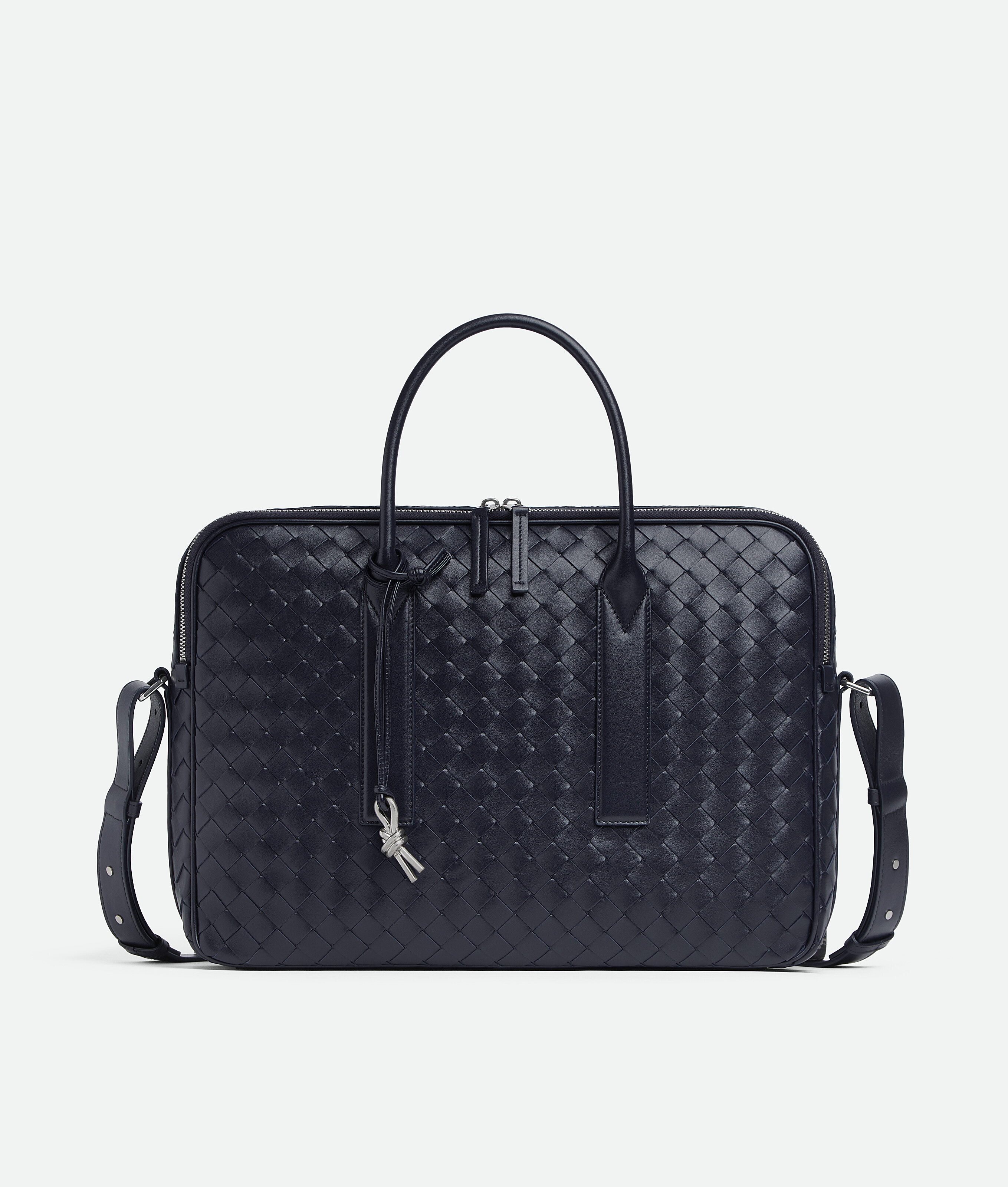 Briefcase in soft Intrecciato leather with adjustable and detachable strap and signature knot detail.
