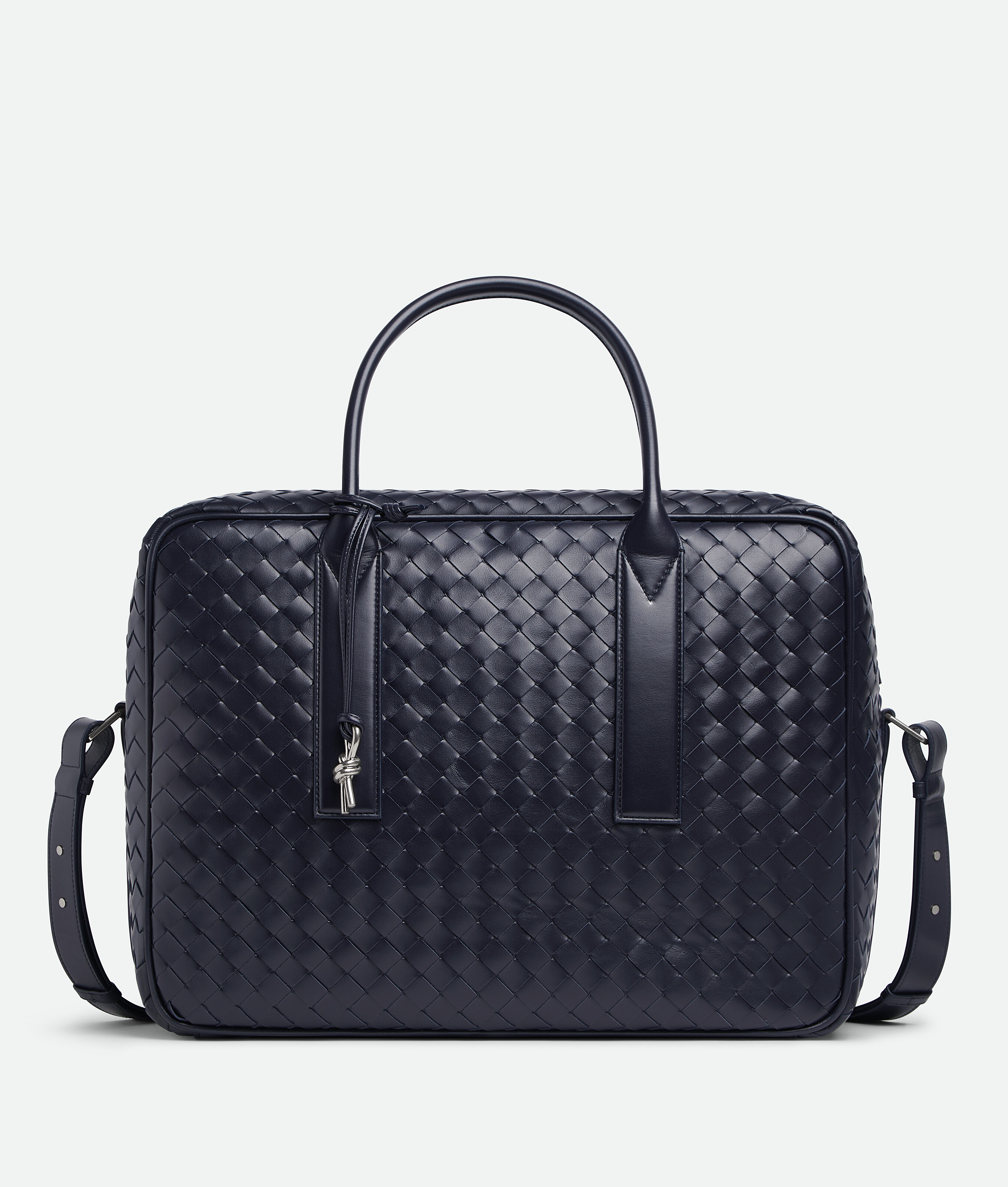 Weekender in soft Intrecciato leather with adjustable and detachable strap and signature knot detail.