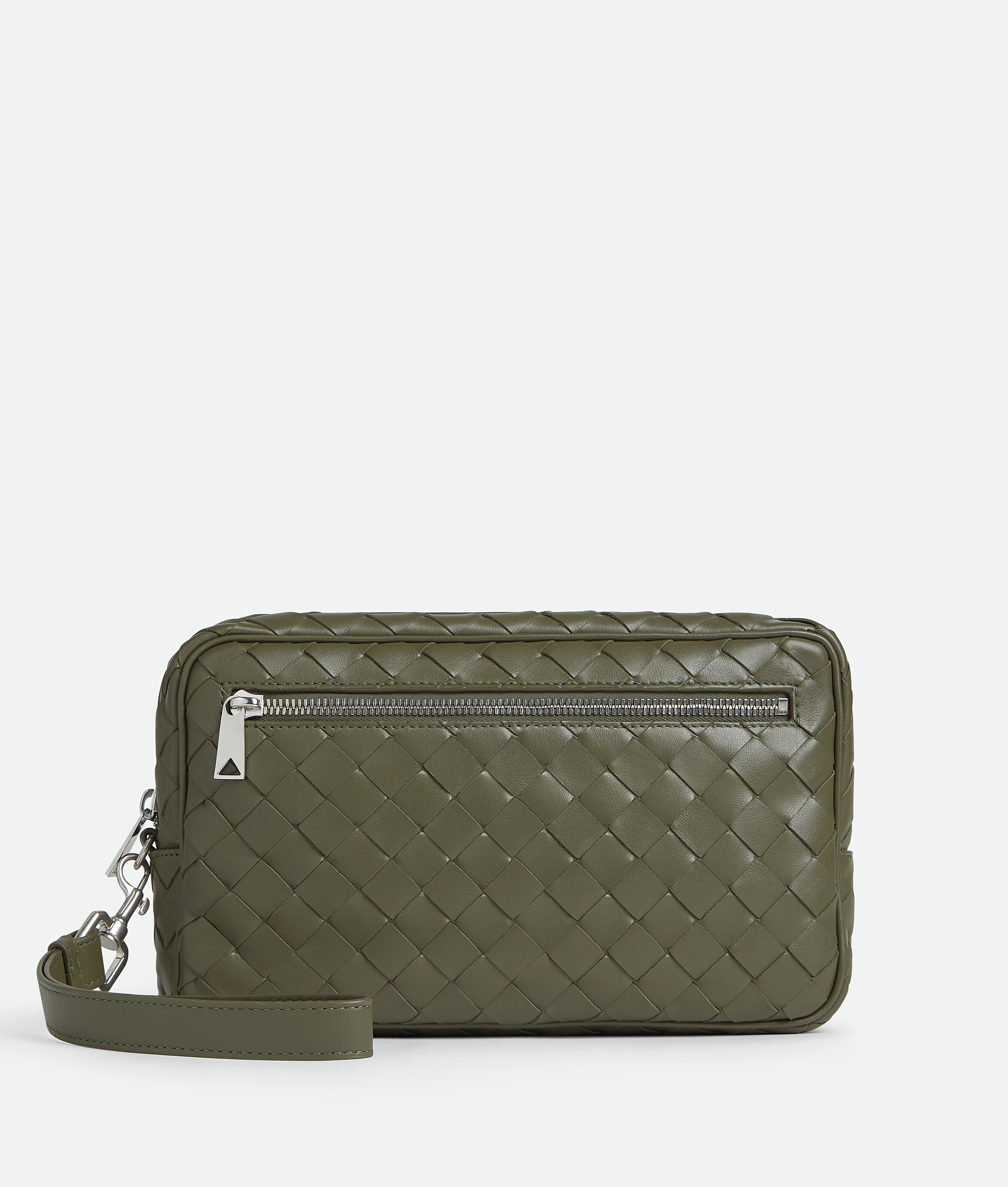 Pouch in Intrecciato calf leather with detachable wristlet.