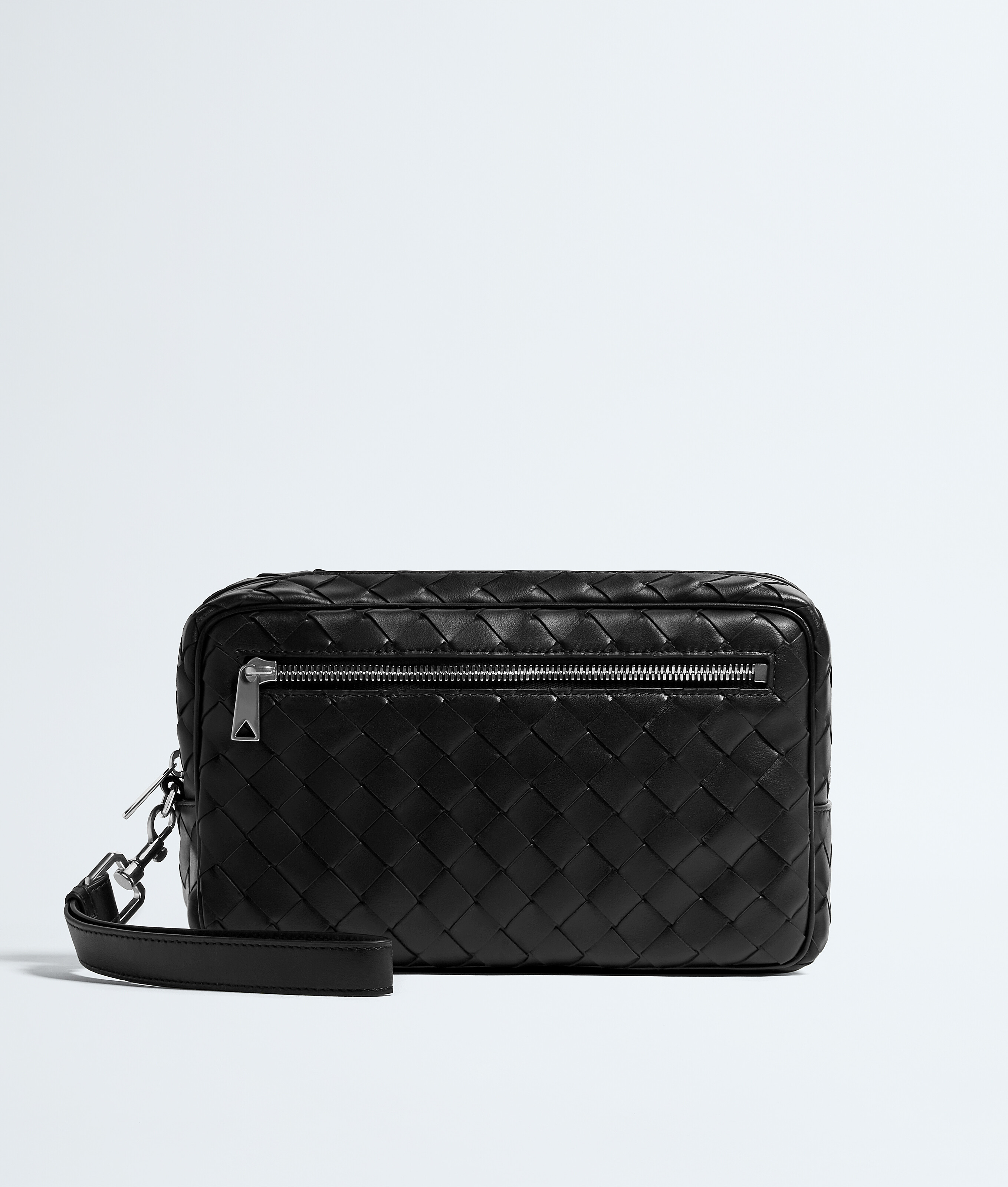 Intrecciato calfskin leather pouch with detachable wristlet.