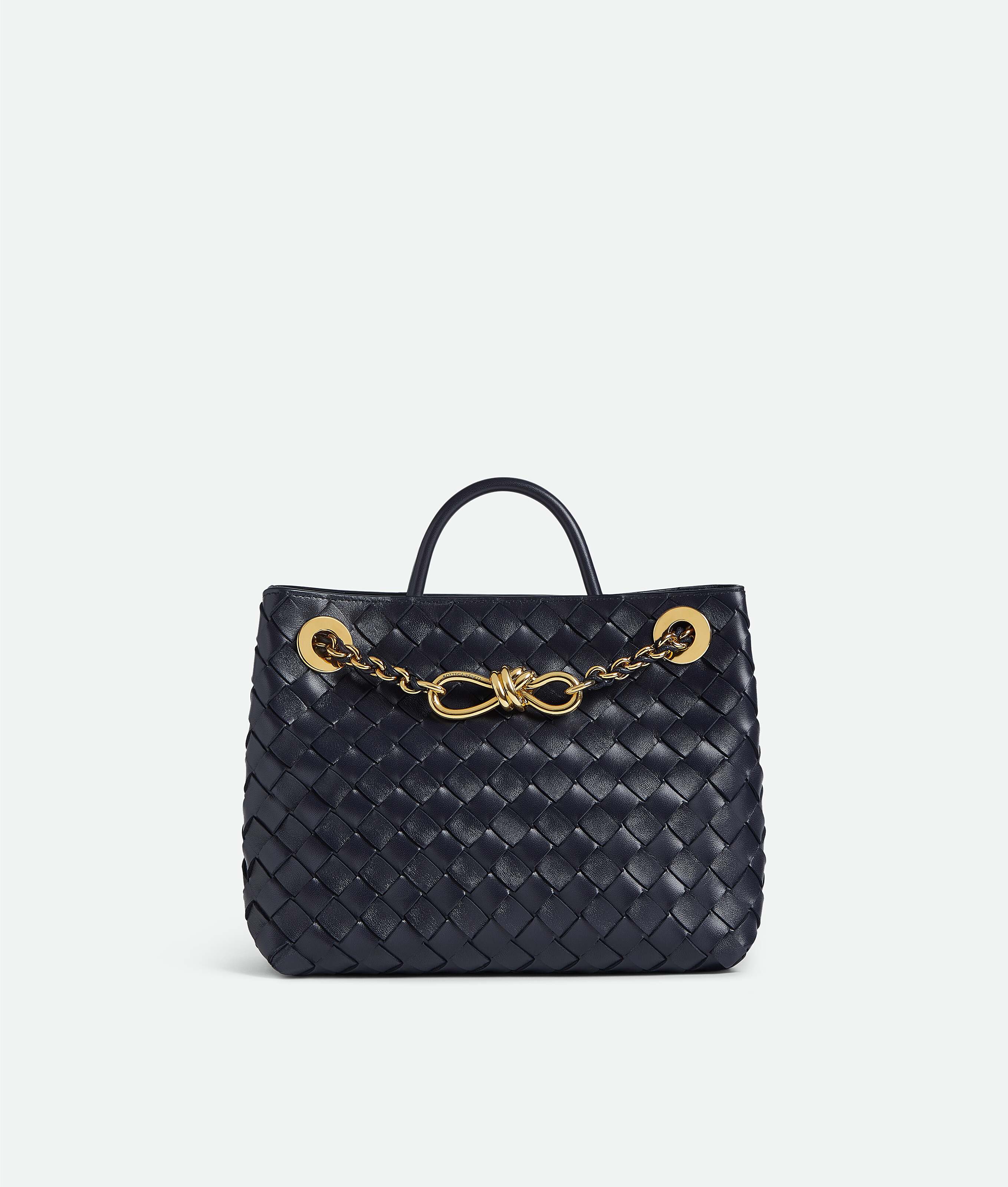 Top handle bag in Intrecciato leather with signature knot detail and tubular leather braided metal chain.