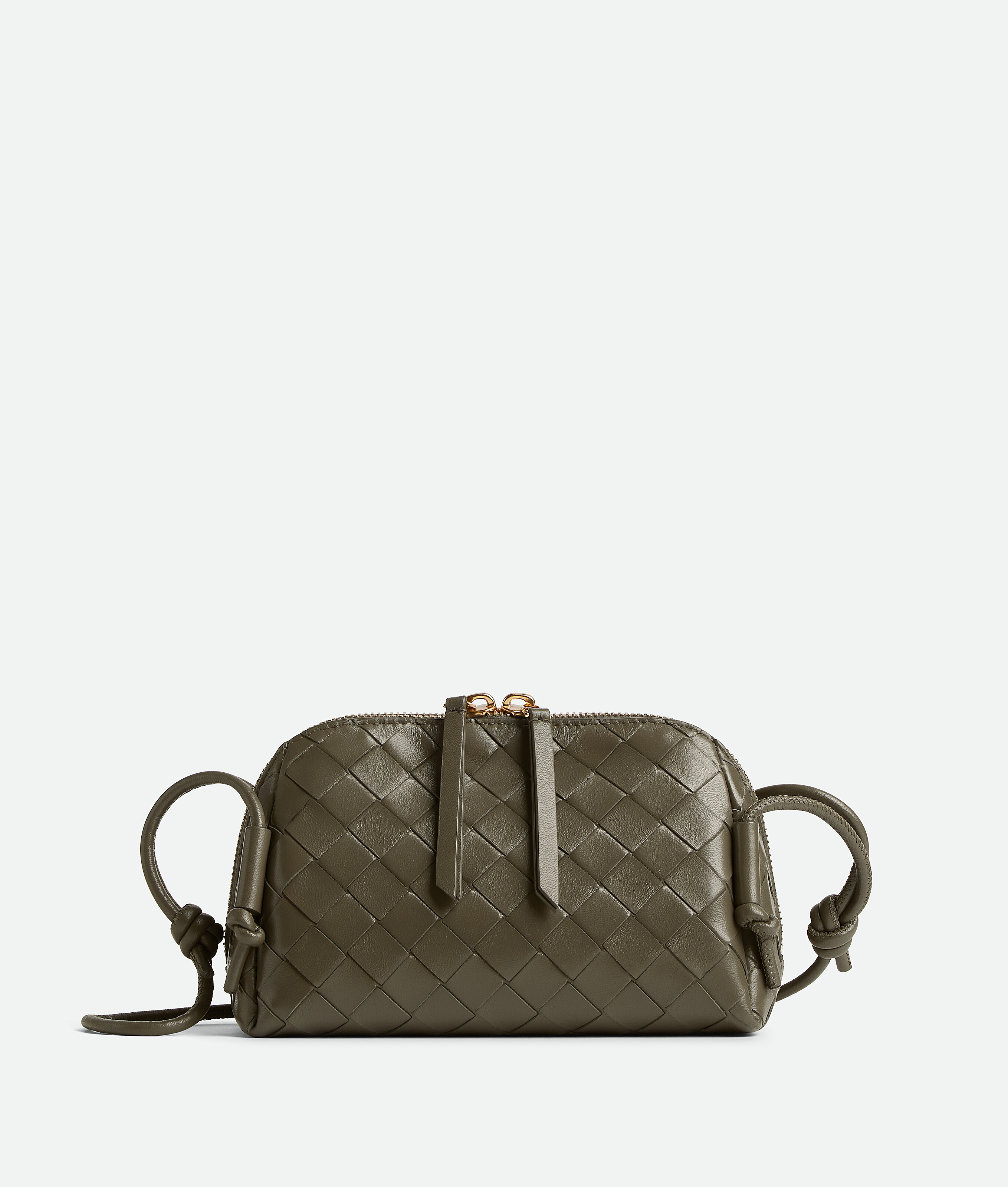 Pouch in Intrecciato nappa leather with adjustable tubular strap featuring sliding knot details.