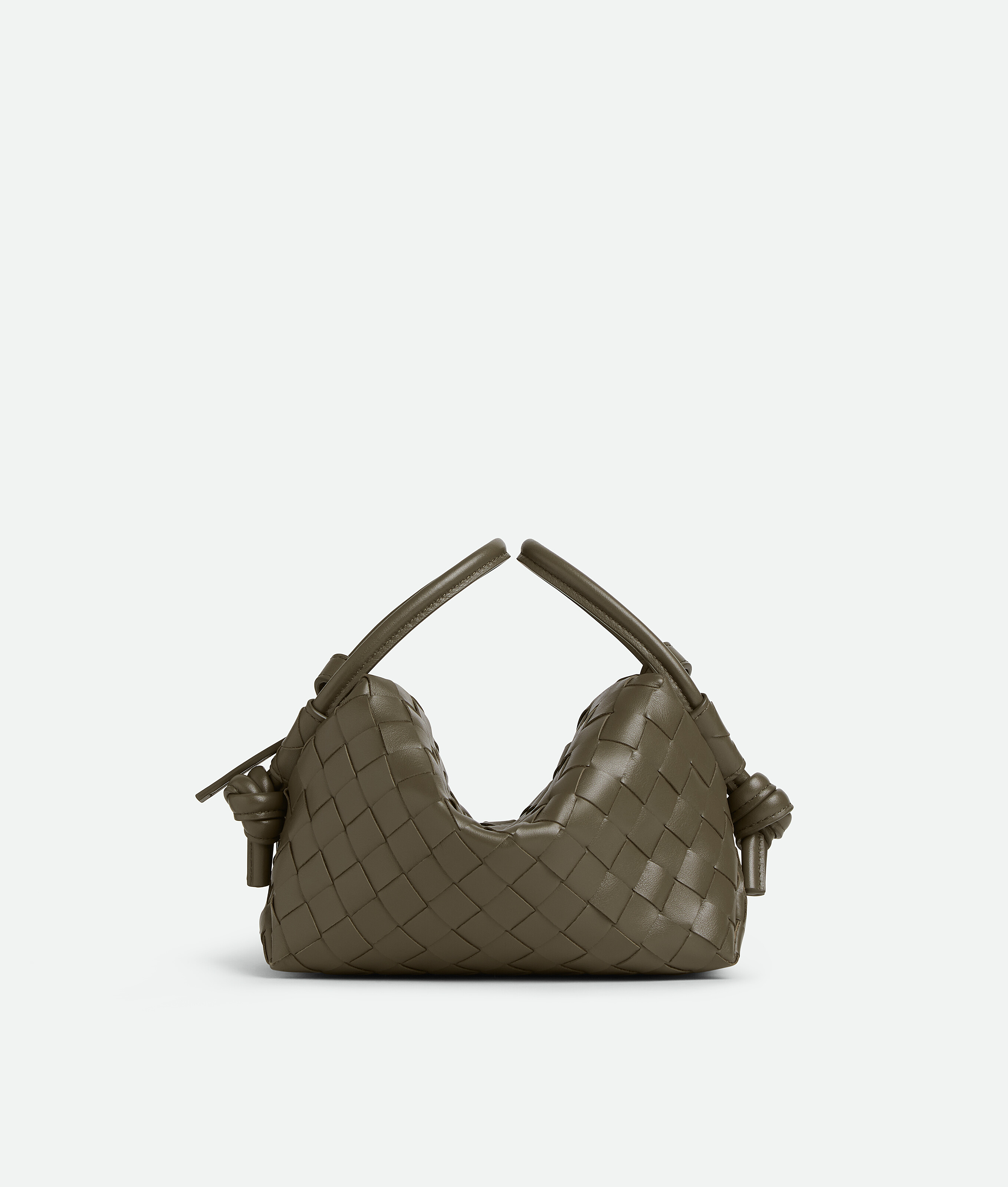 Intrecciato leather cross-body bag with double handles and detachable strap.