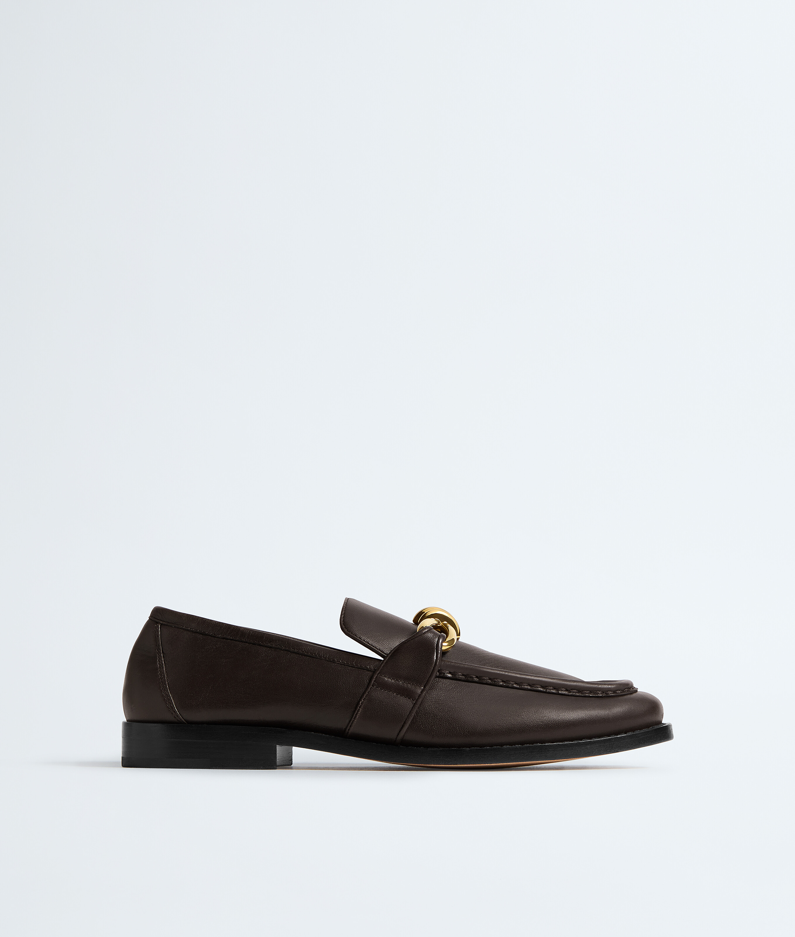 Loafer realised in soft calfskin leather with signature metallic knot detail.