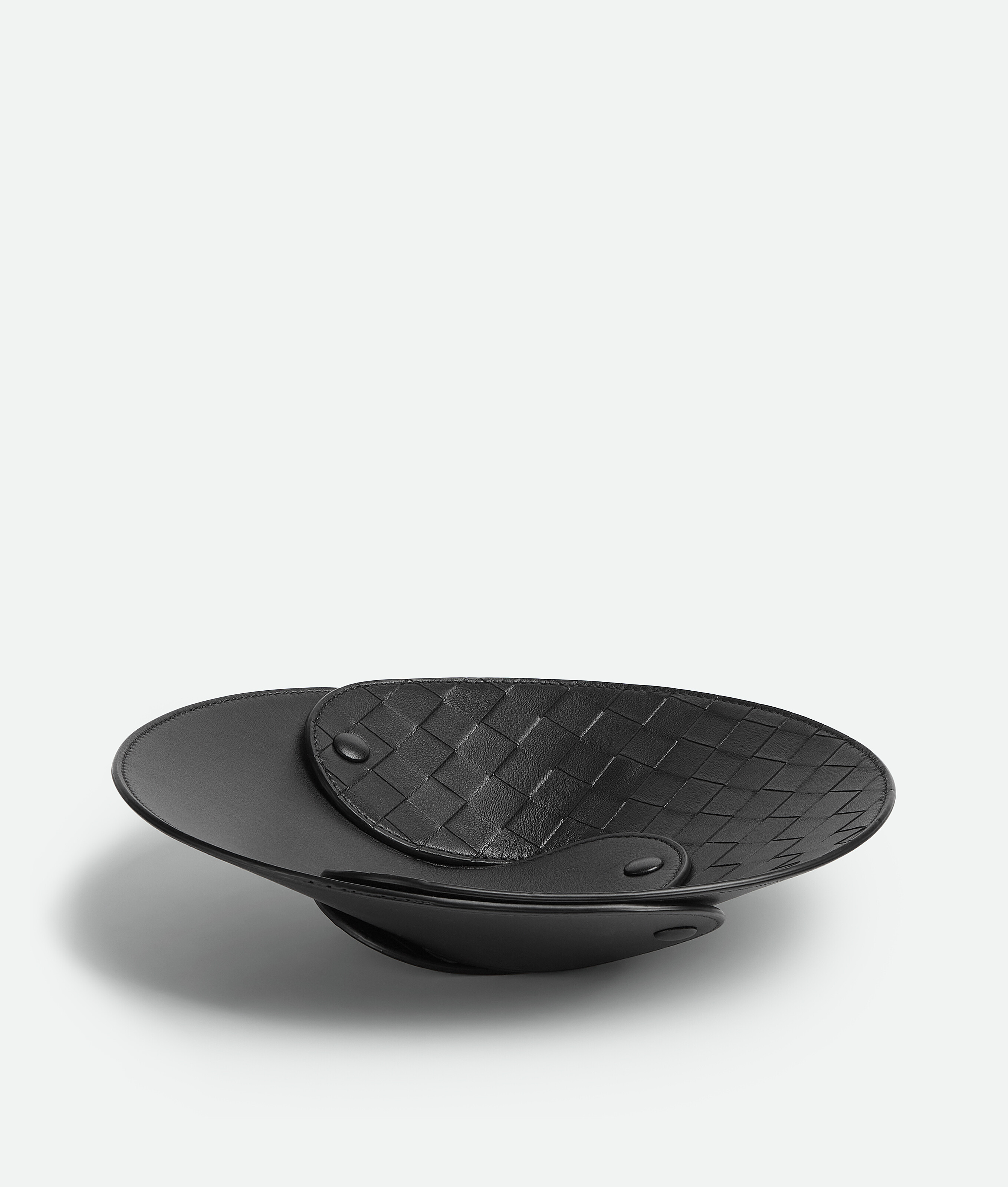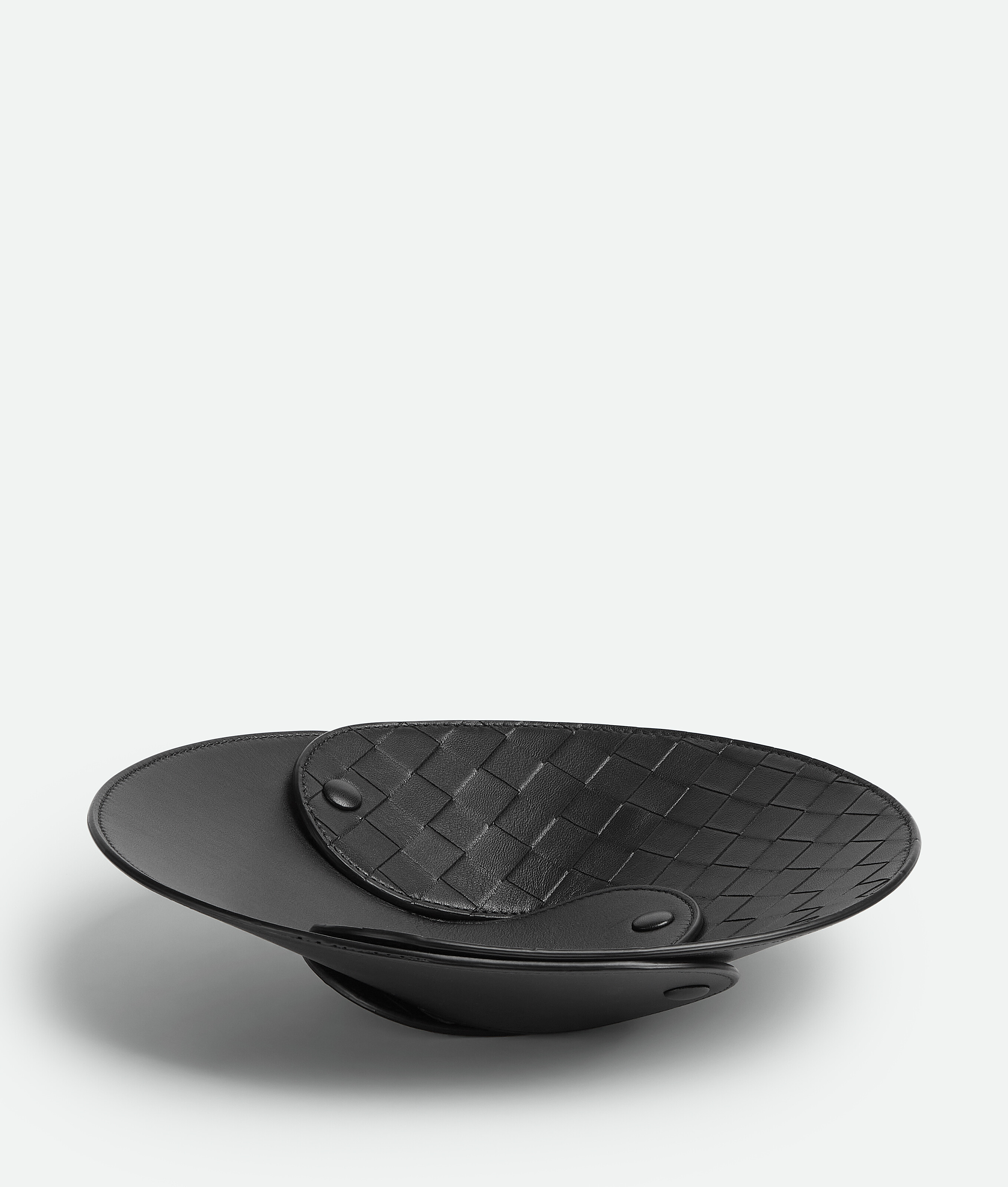 Decorative leather tray with interchangeable elements featuring Intrecciato craftsmanship.