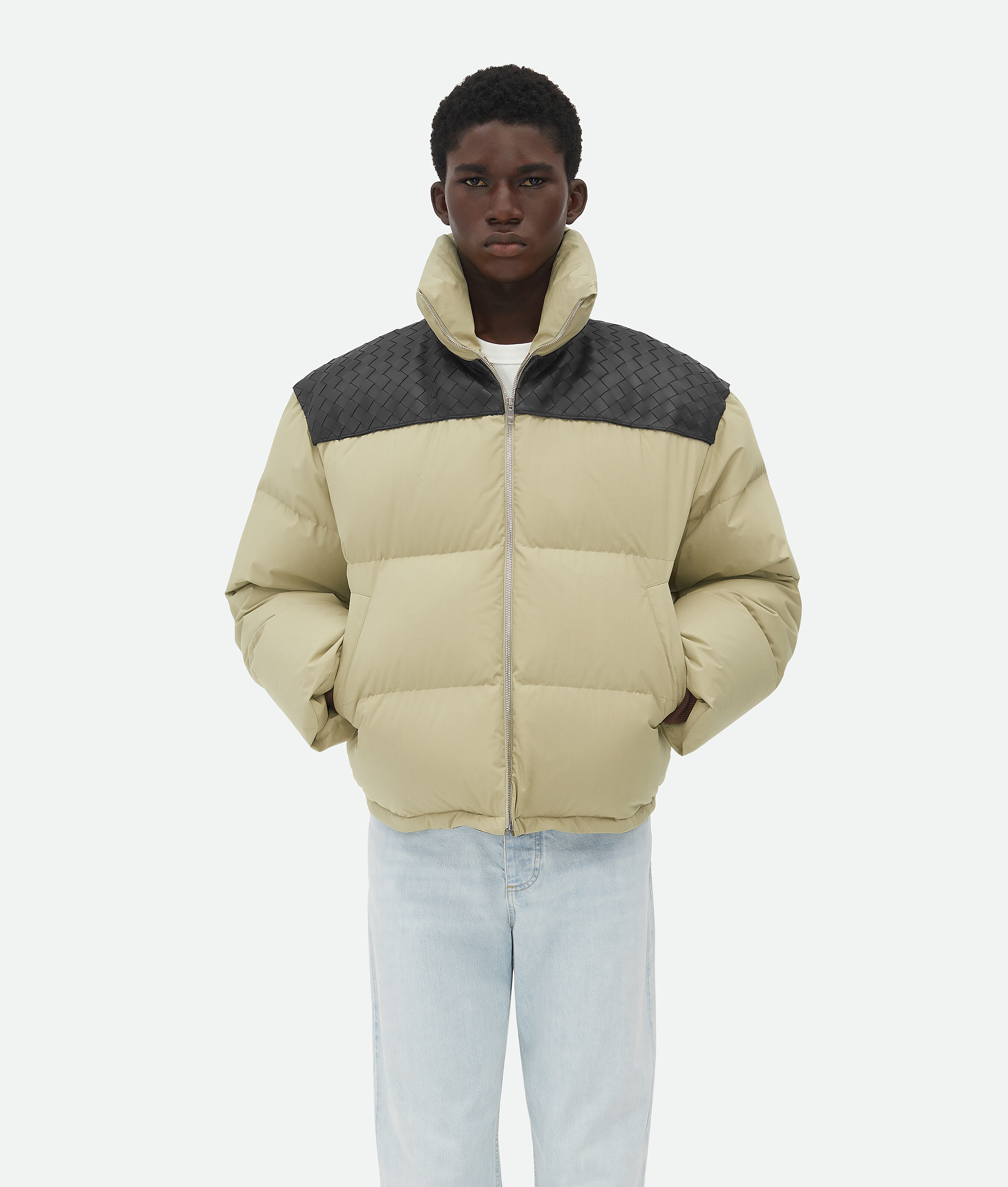 Puffer jacket in organic frosted poplin with Intrecciato leather detail, and a lightweight down and feather filling.