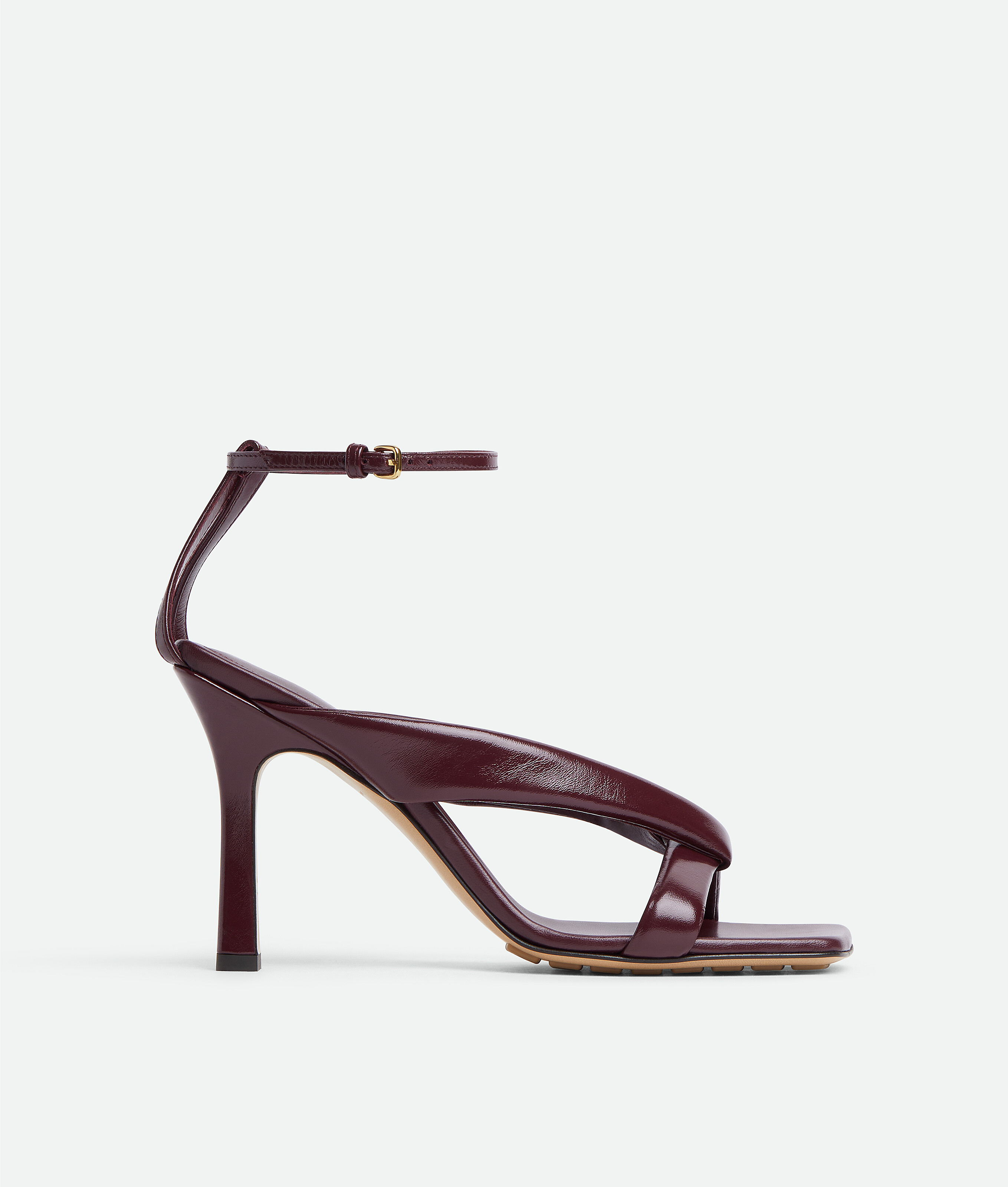Ankle strap sandal in shiny calfskin with padded tubular straps and twisted design.