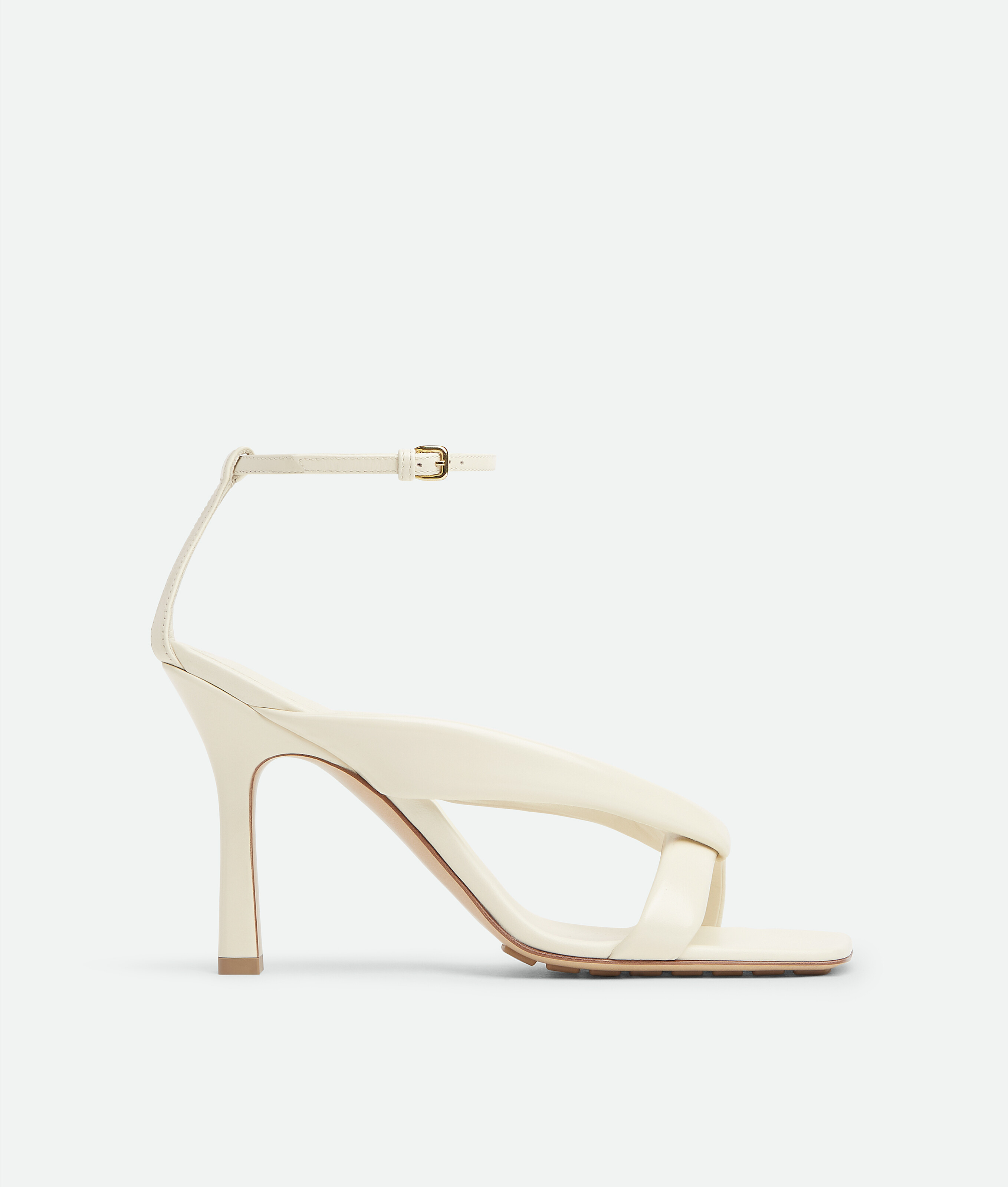 Ankle strap sandal in shiny calfskin with padded tubular straps and twisted design.