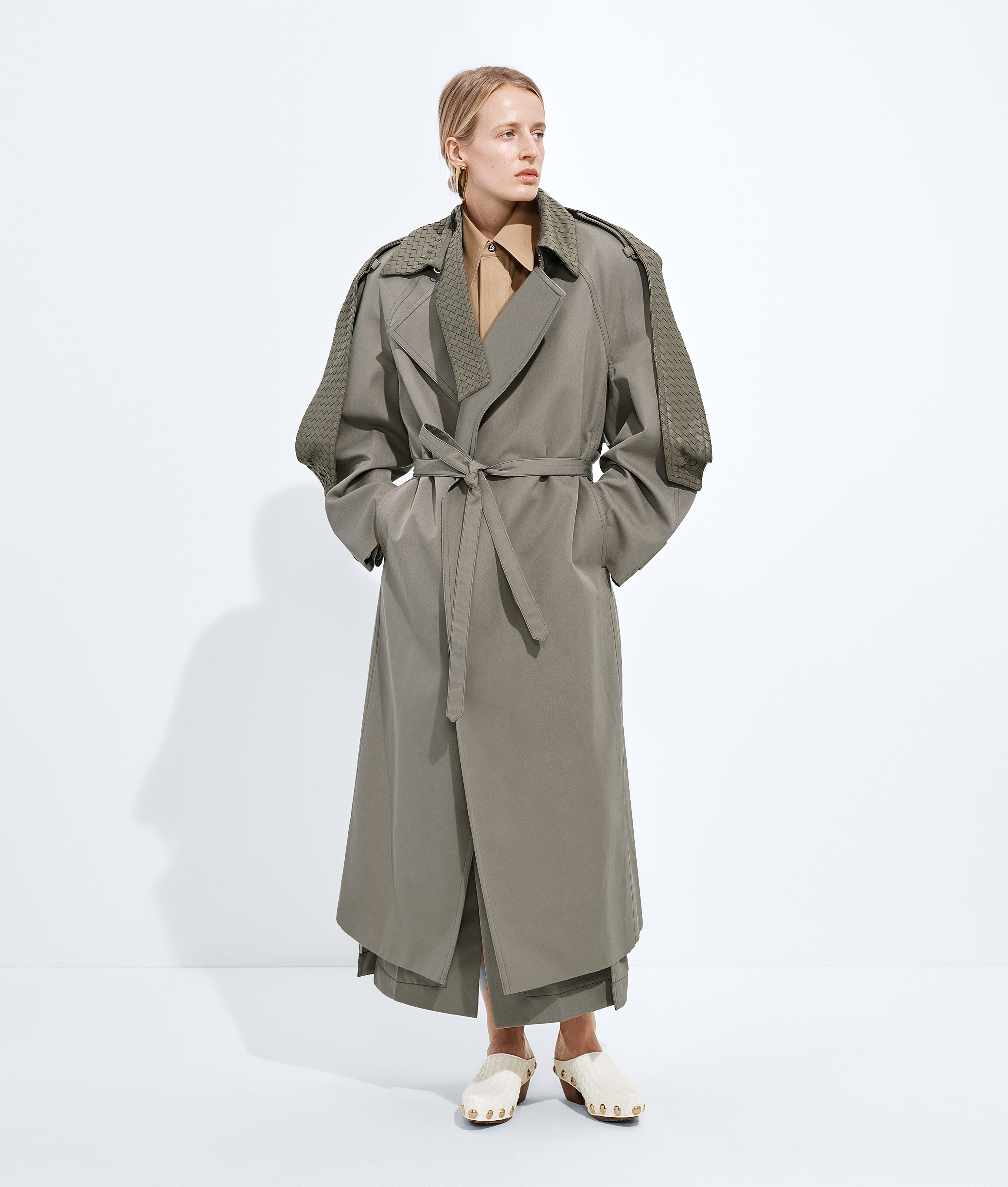 Oversized trench in cotton and silk gabardine, featuring an Intrecciato leather collar and matching elongated epaulets.