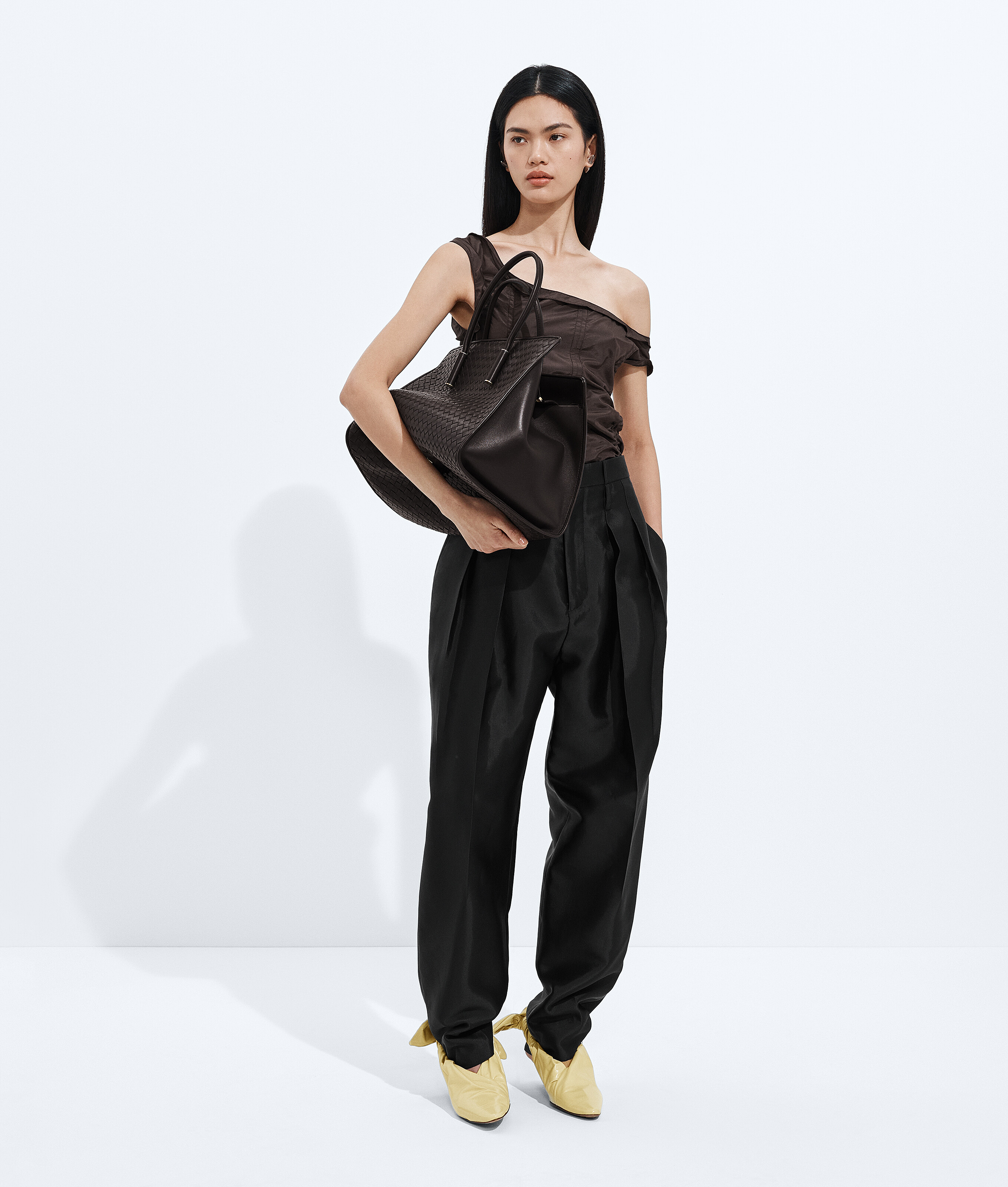 Pants with tapered leg made from shiny washed cotton and viscose twill.