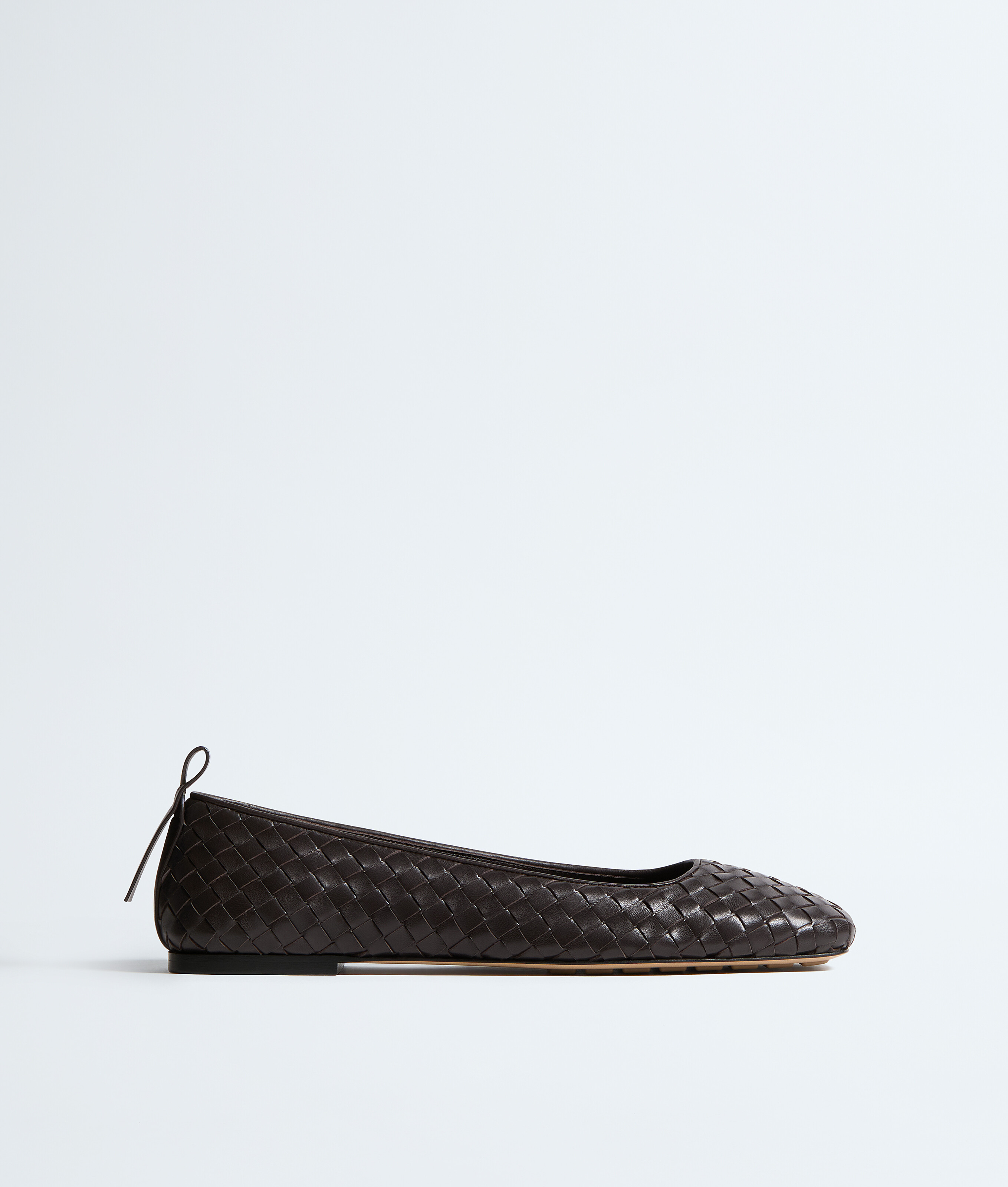 Ballerina with squared toe in Intrecciato leather, featuring a leather loop detail at the back.