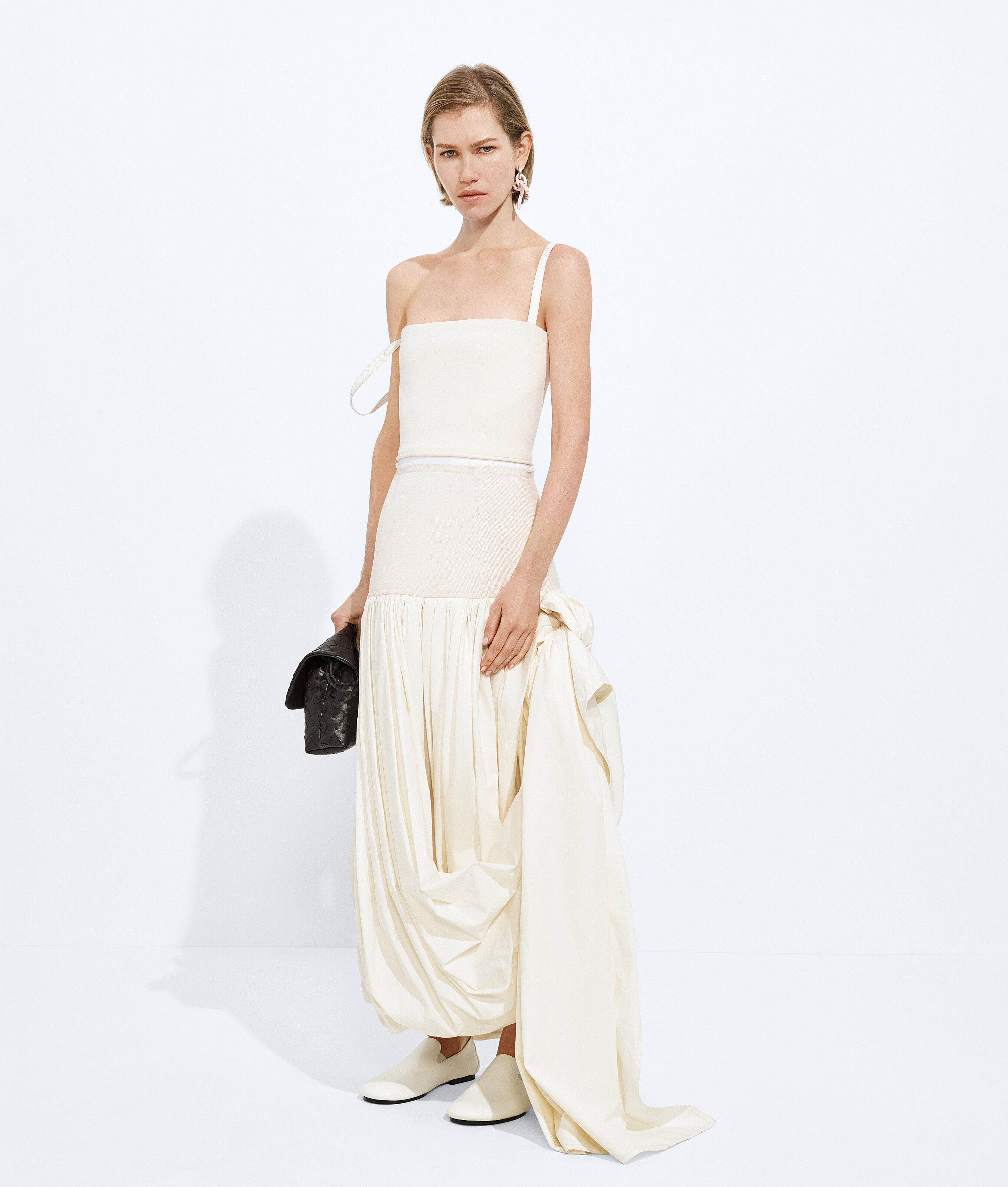 Dress with balloon silhouette made from wool gabardine, featuring one dropped shoulder.