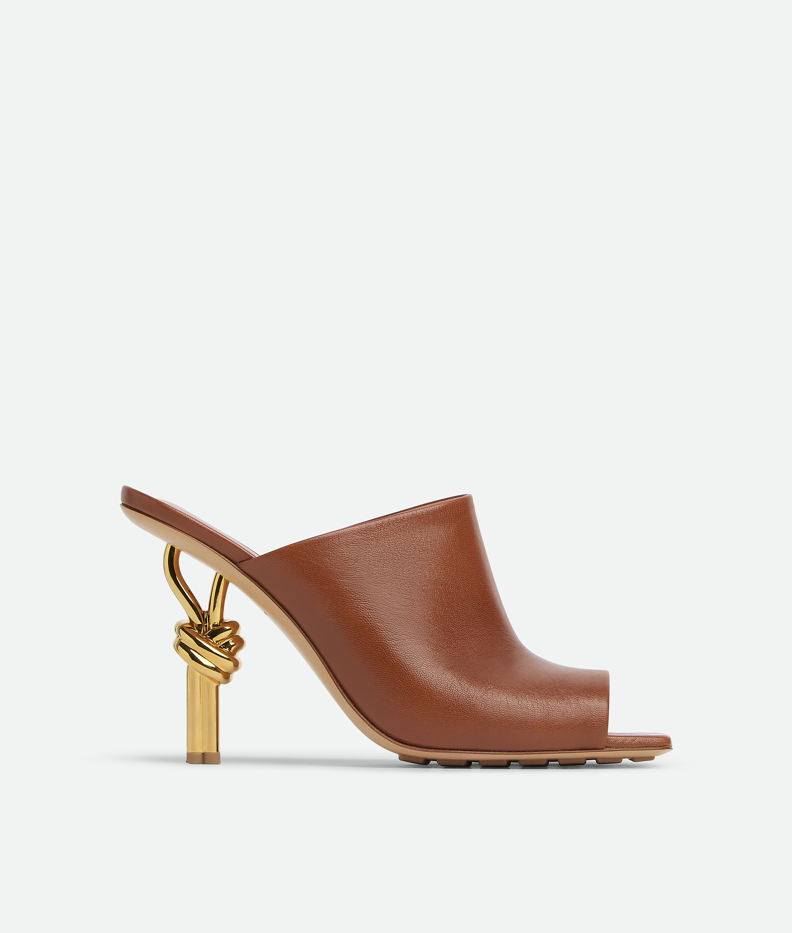 Mules à talon en métal doré orné d’un nœud. Cuir d’agneau doux et semelle extérieure en cuir.