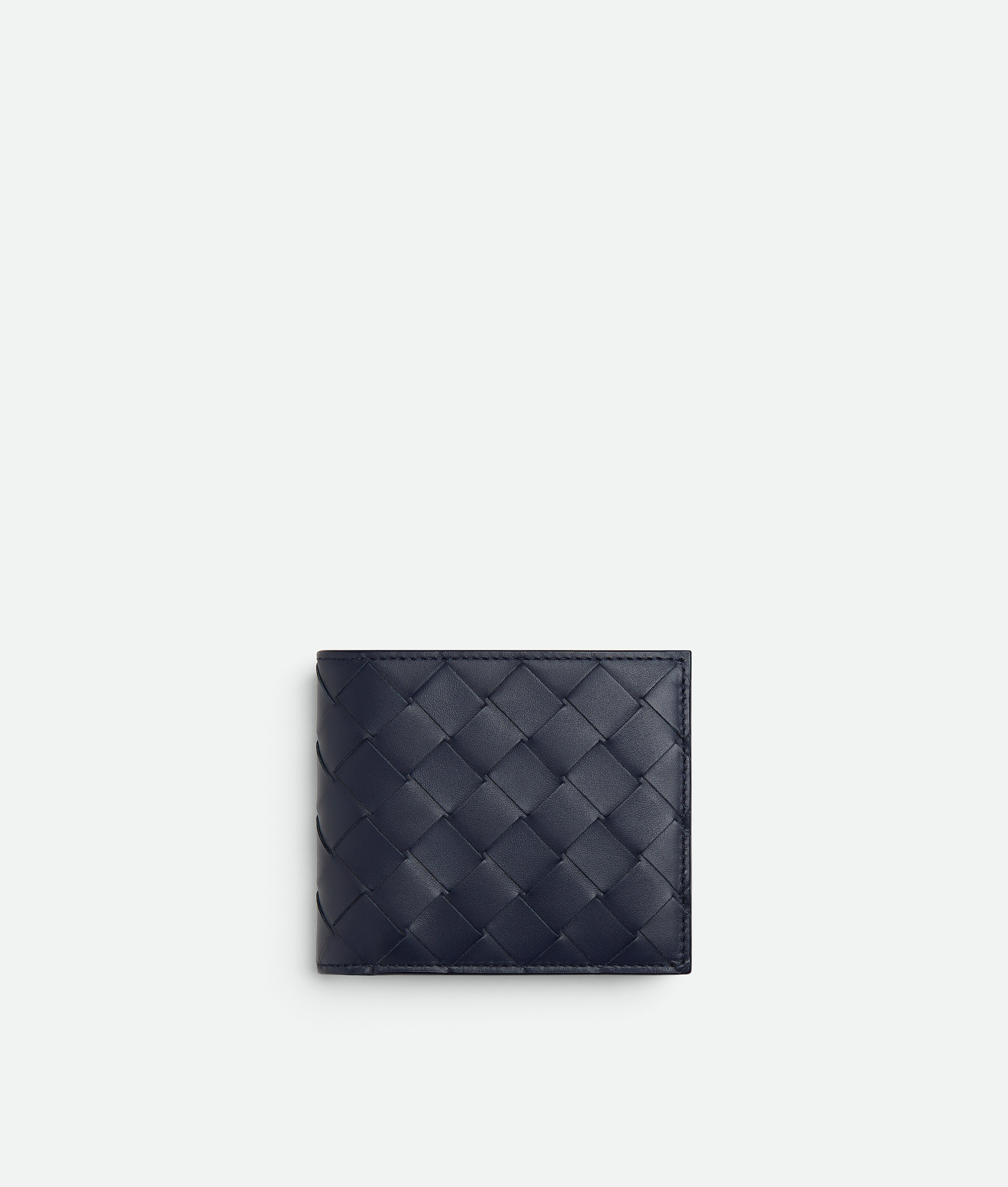 Portefeuille bi-fold en cuir de veau Intrecciato avec intérieur contrastant et porte-monnaie.