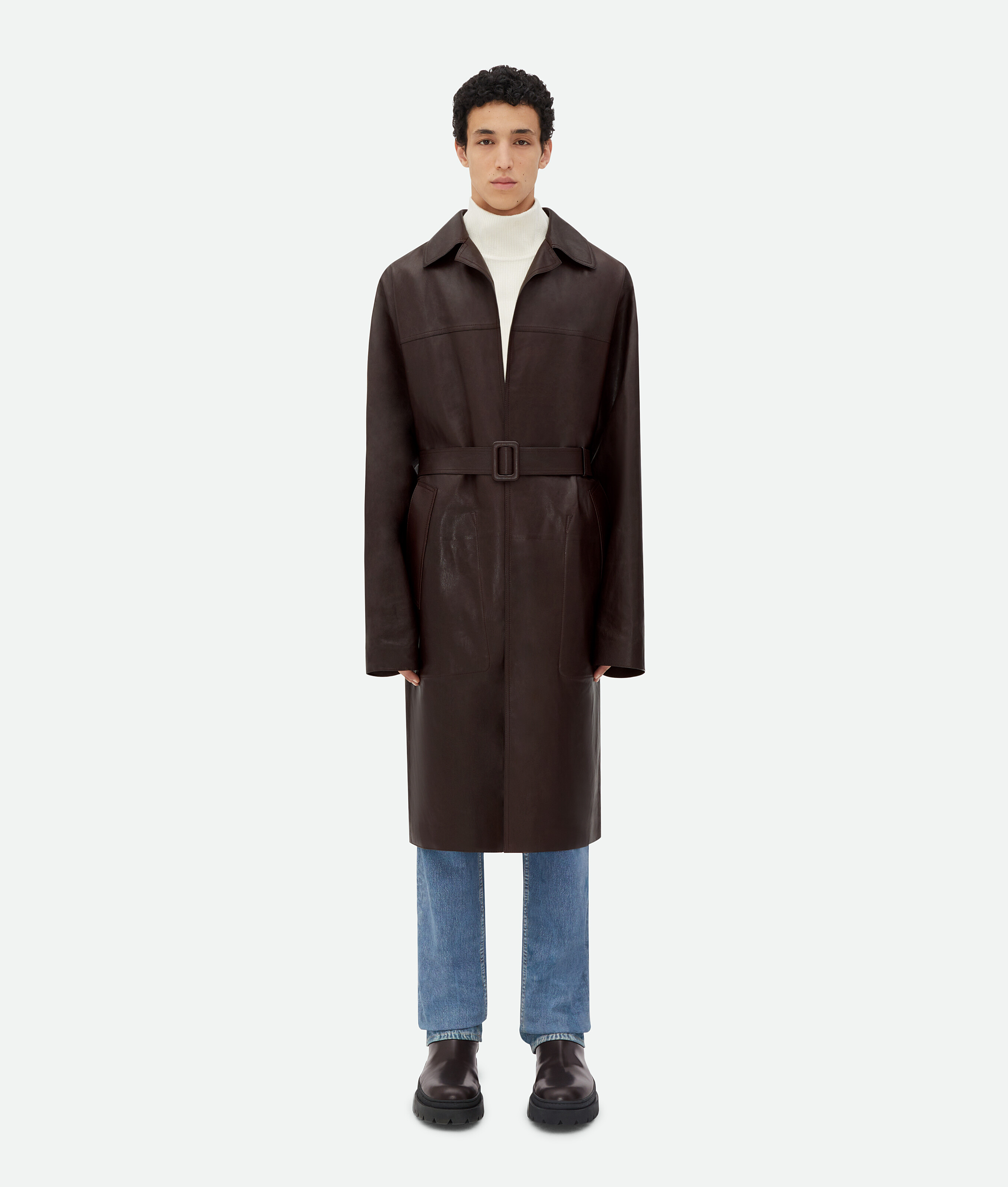 Manteau à silhouette oversize ceinturée réalisé en cuir nappa brillant et léger.