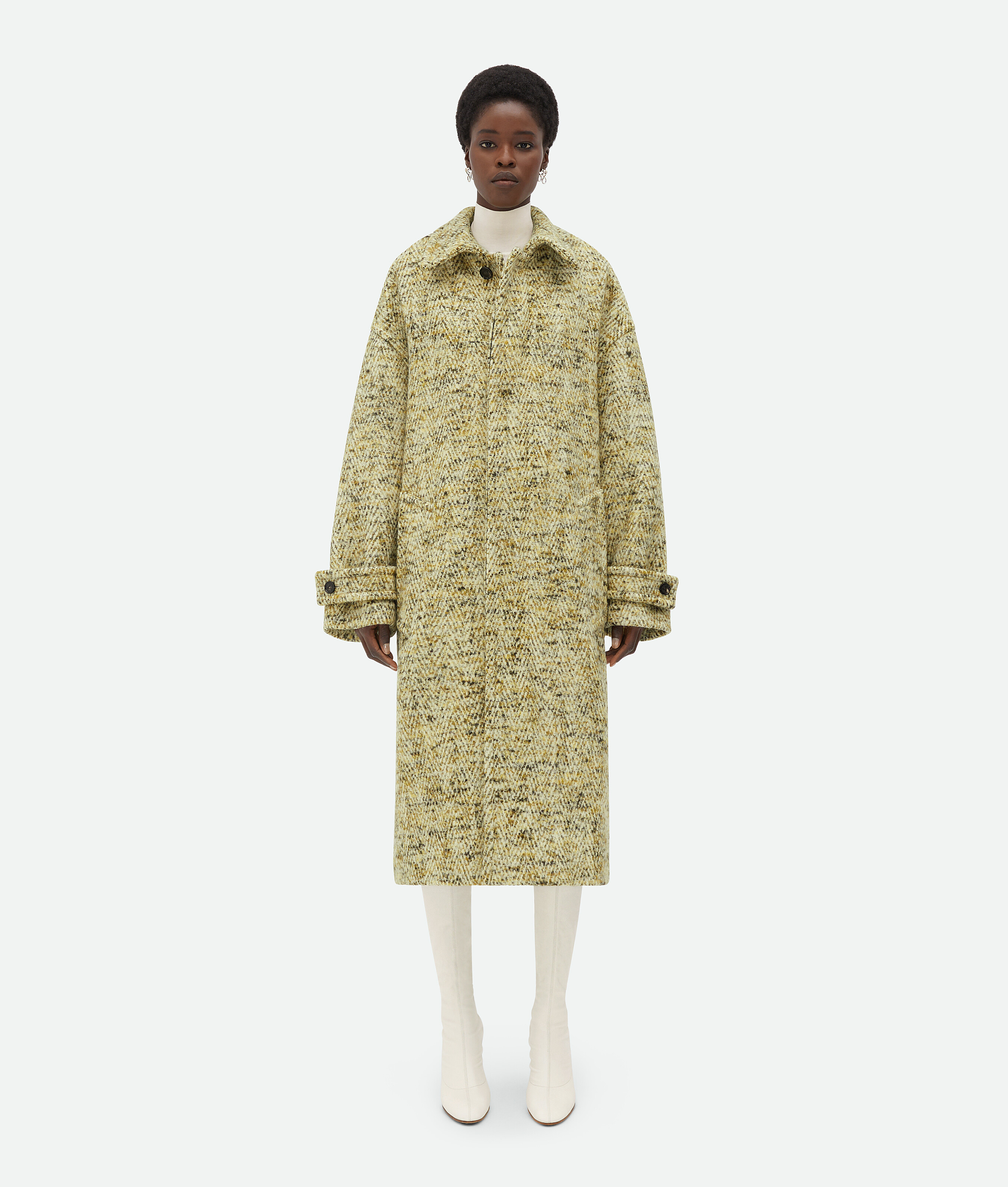 Manteau à silhouette kimono réalisé en laine moulinée à motif chevron avec finition multicolore développée pour la maison. Avec étiquette spéciale à l'intérieur.