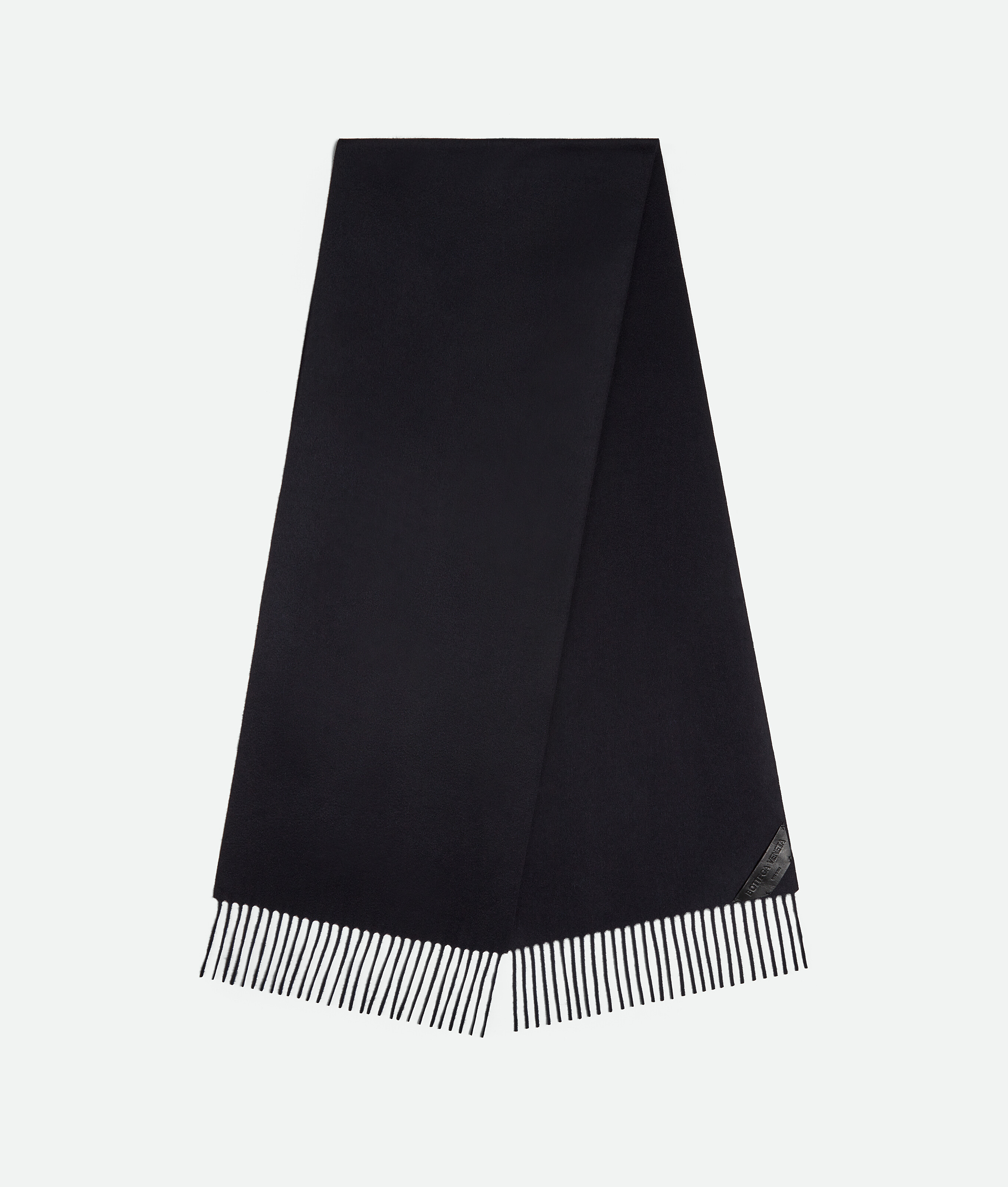Echarpe réalisée en cachemire doux avec patch en cuir embossé du nom de la maison.