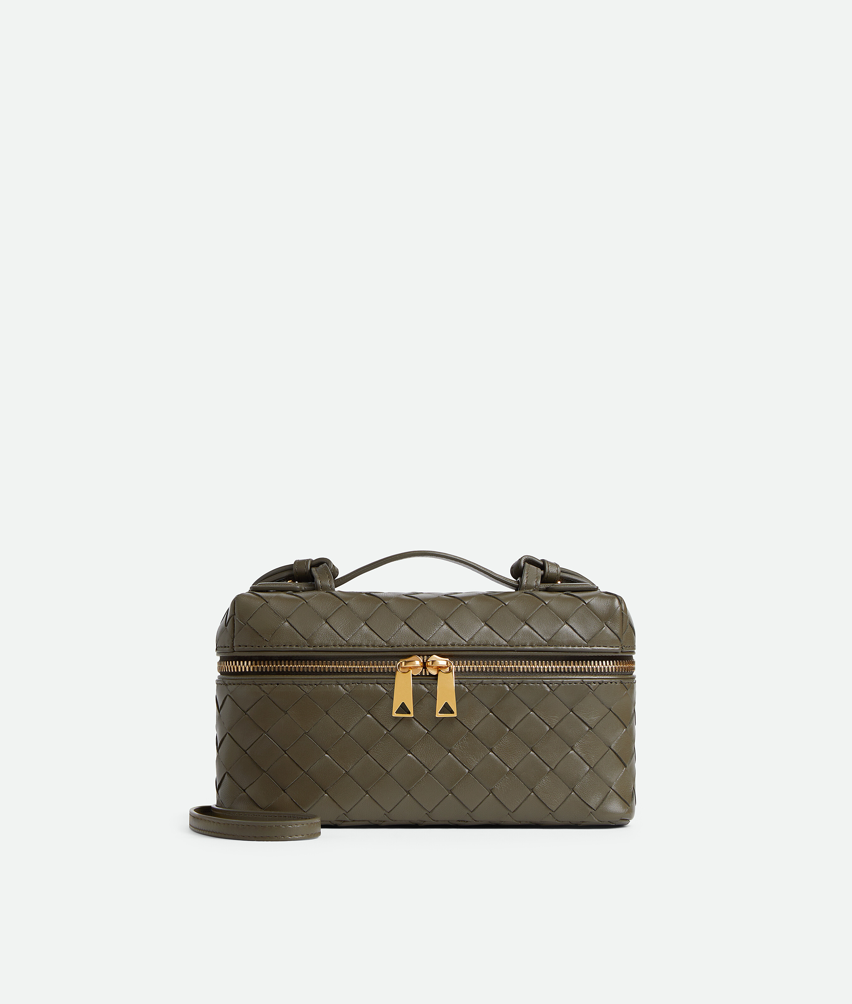 Vanity case en cuir Intrecciato avec bandoulière amovible.