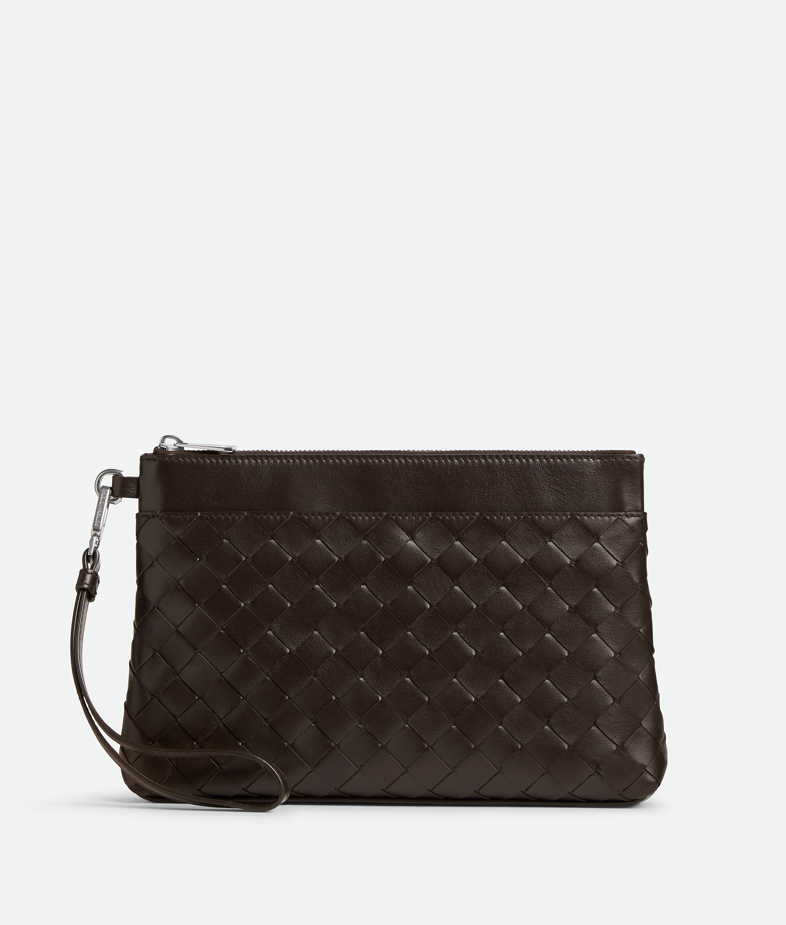 Pochette en cuir de veau Intrecciato avec dragonne amovible.