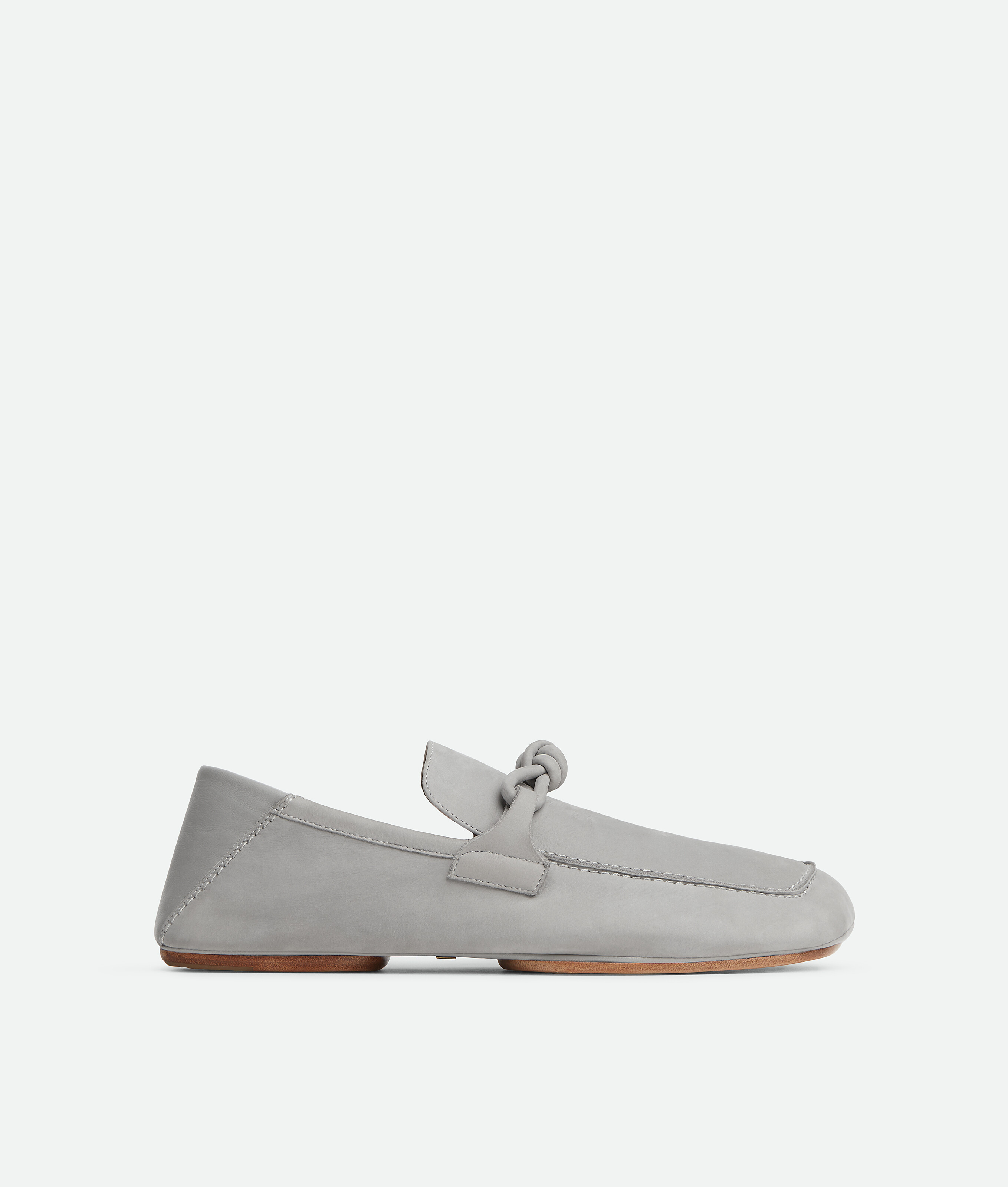 Mocassin en nubuck avec dos repliable, détail knot signature en cuir et semelle cousue composée de deux parties en cuir.