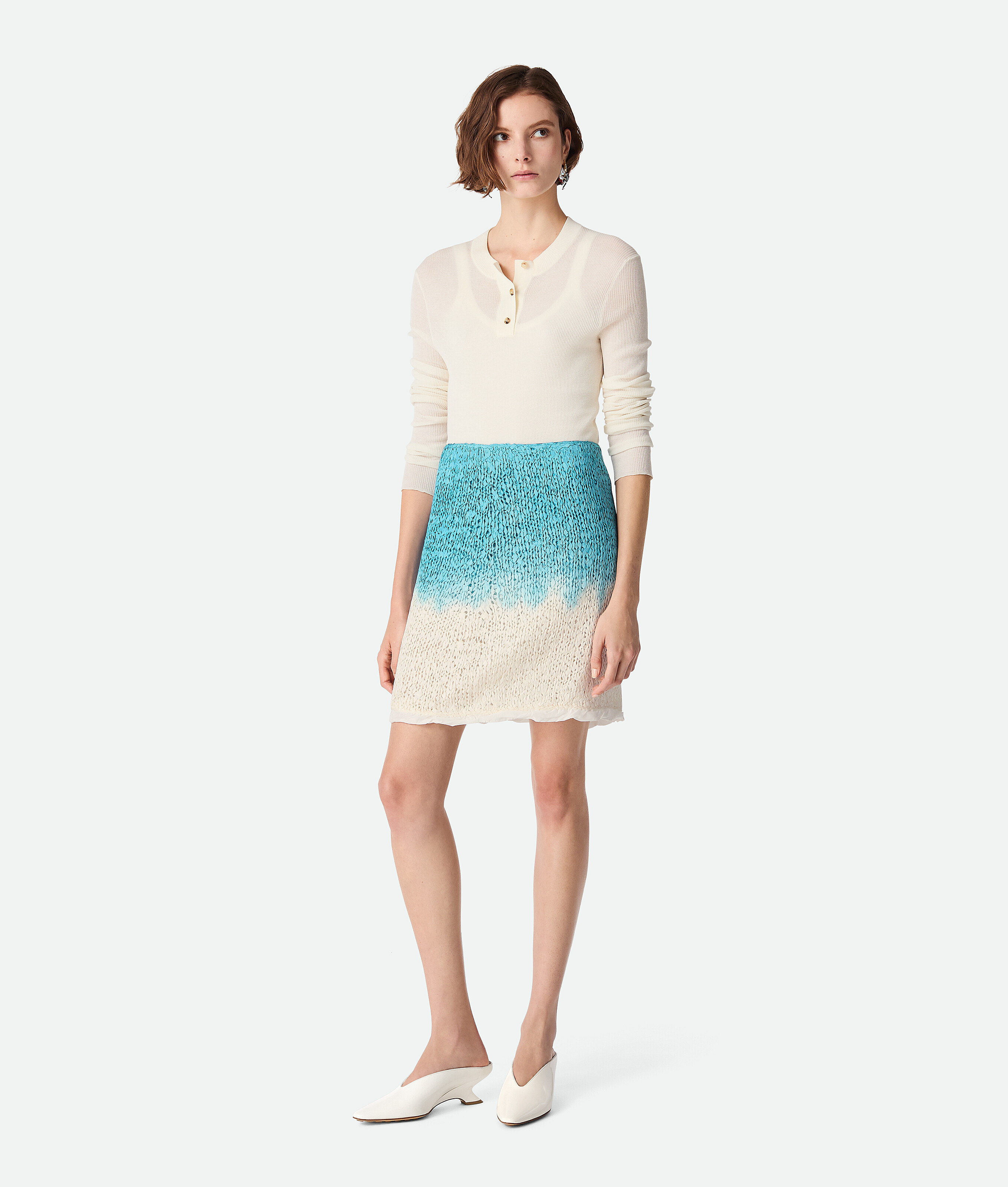 Jupe mini en laine et soie légères, réalisée avec une technique de teinture en dégradé.