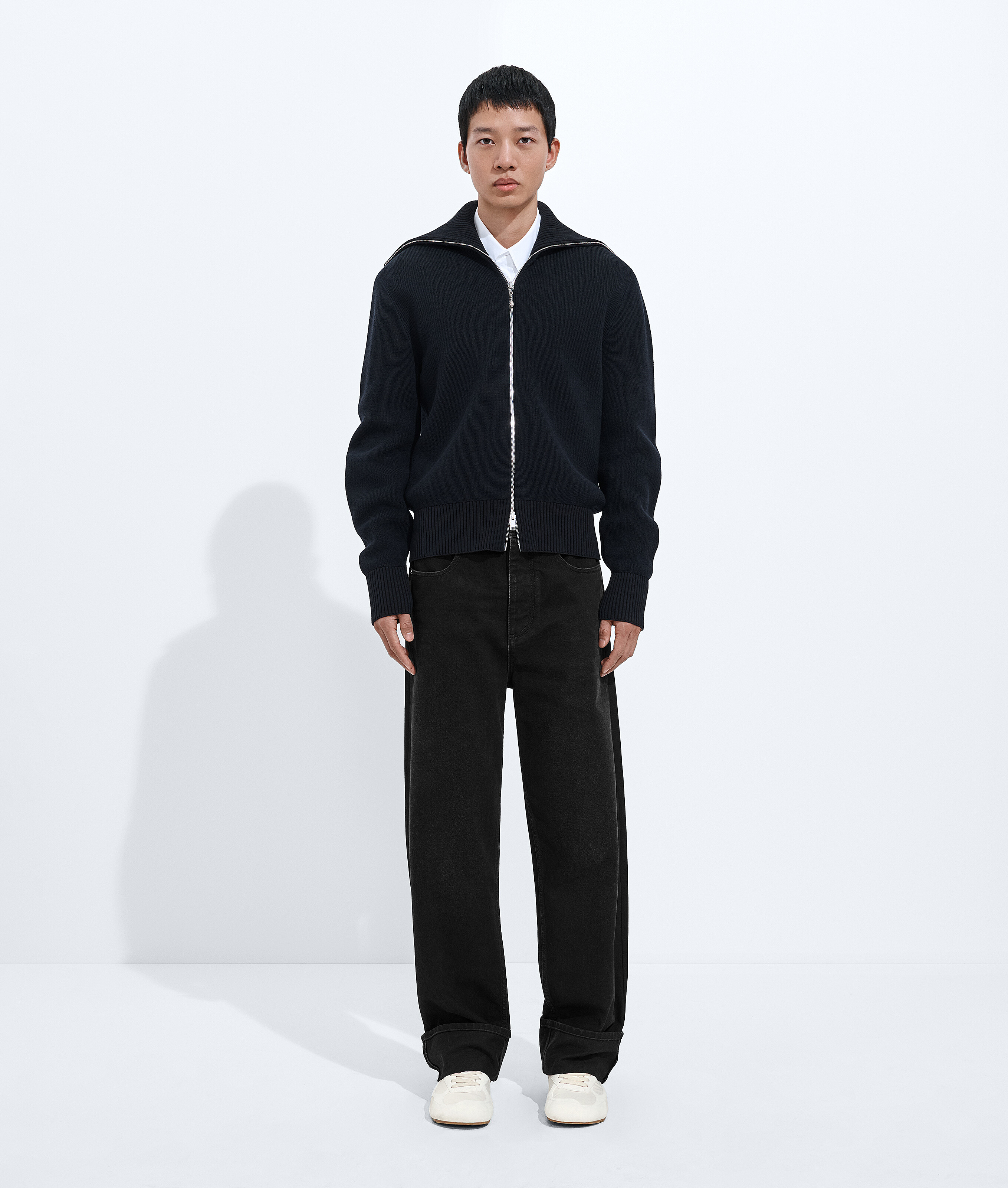 Jean ample en denim délavé noir avec ourlet retroussé et empiècement arrière en cuir Intrecciato embossé.