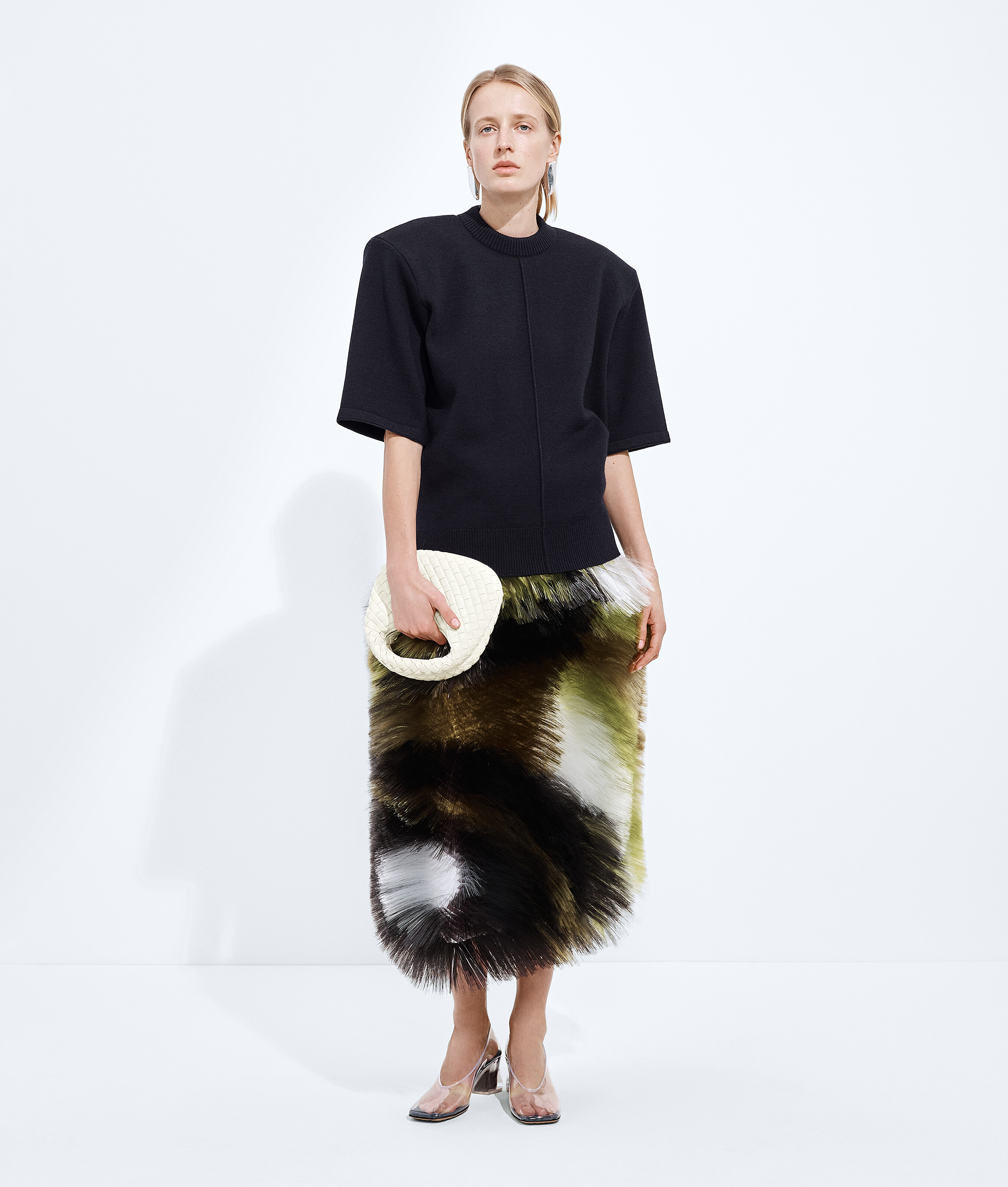Jupe volumineuse avec franges brodées sur toute la surface pour créer un effet graphique multicolore mouvant.