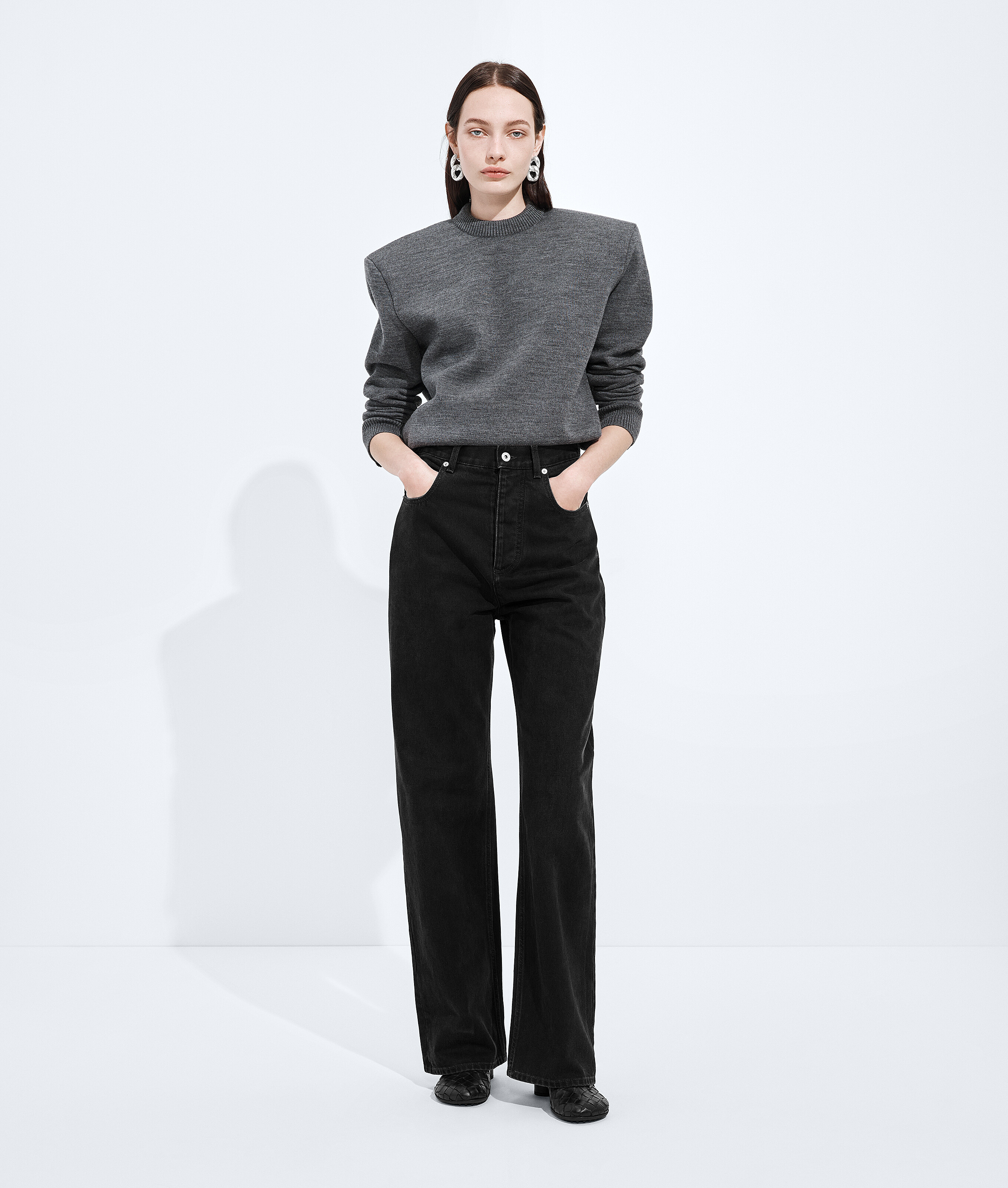 Jean ample à taille haute en denim délavé noir avec empiècement arrière en cuir Intrecciato embossé.