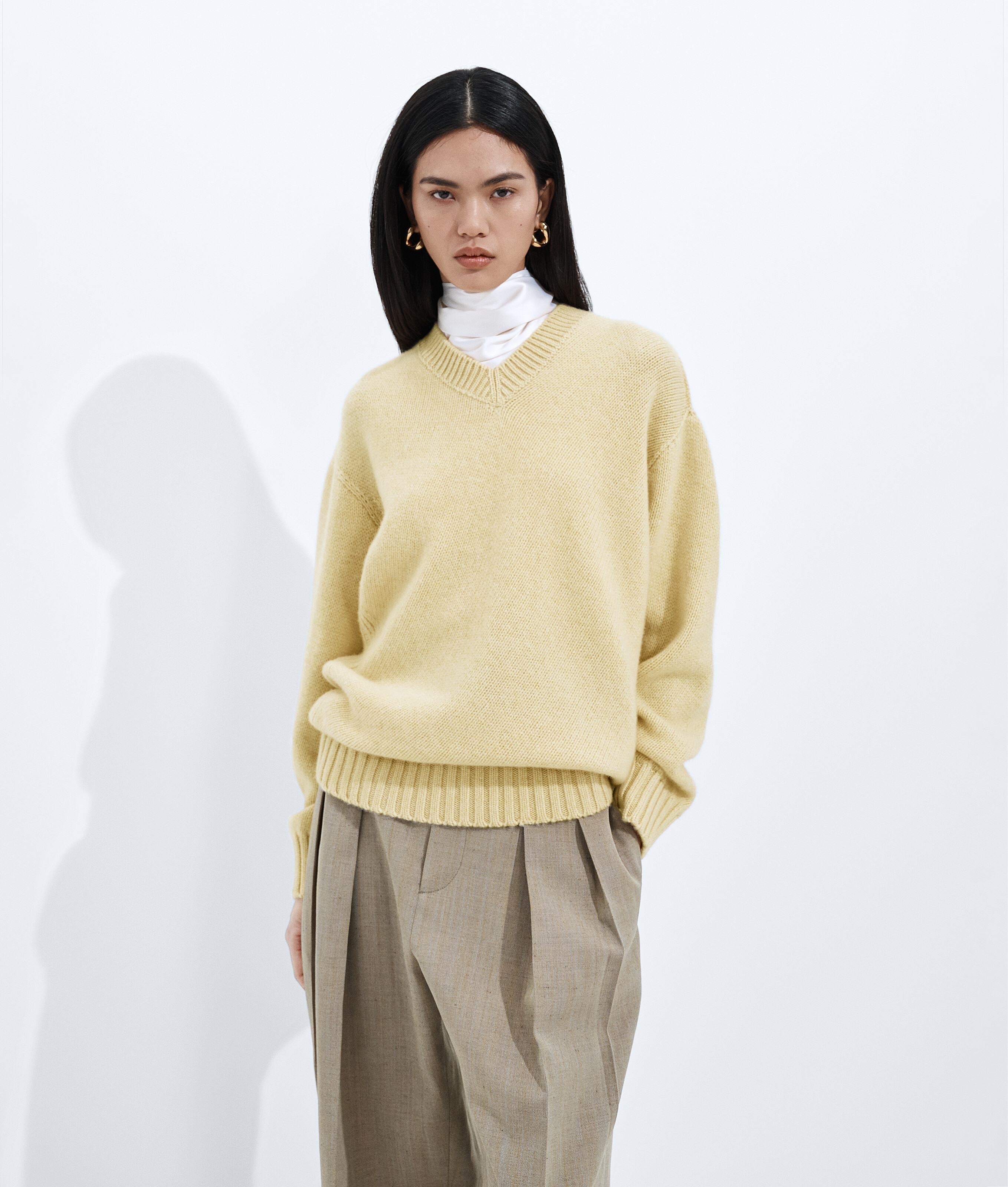 Pull oversized en cachemire semi-épais avec coutures en diagonale et torsades sur les côtés.