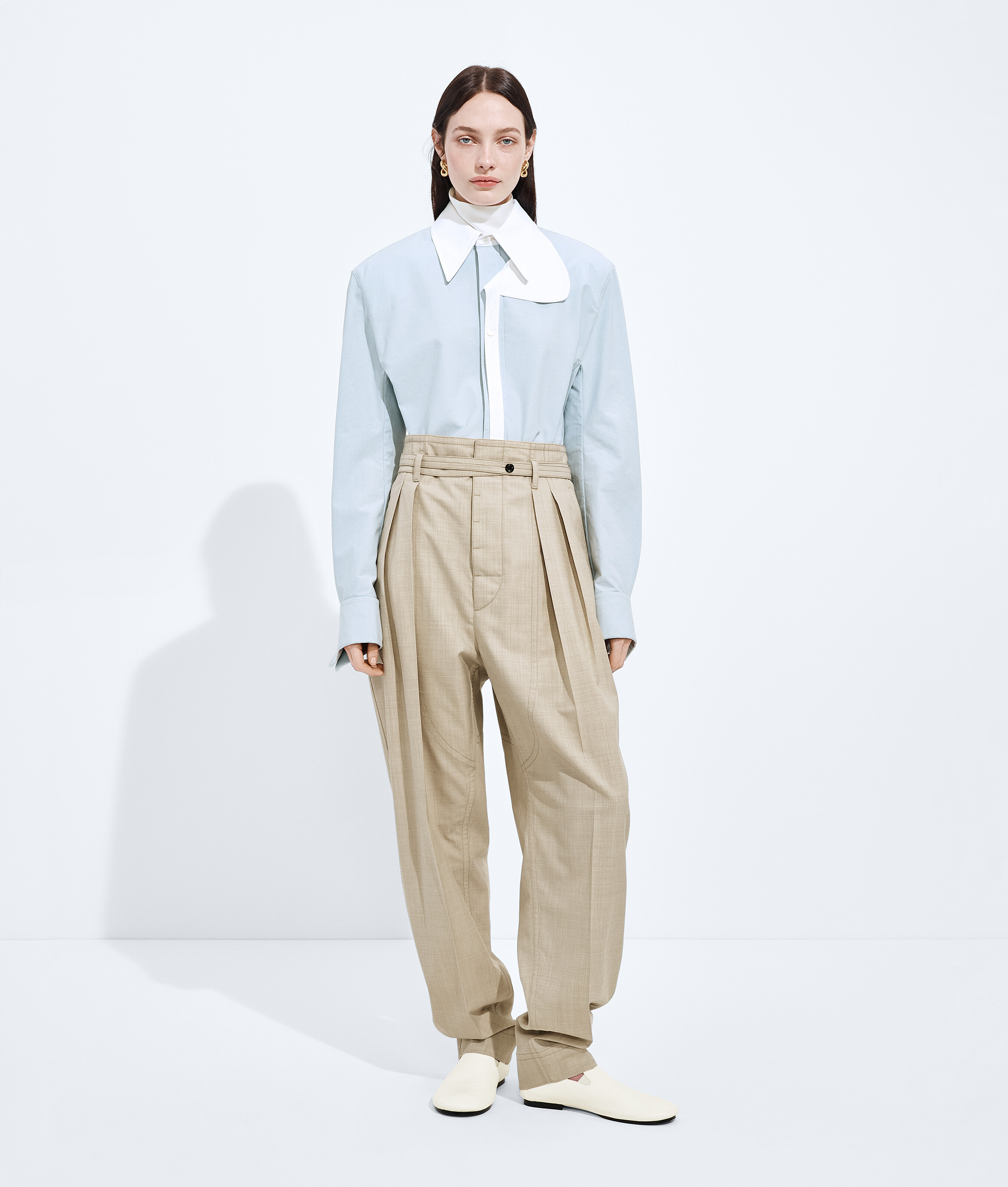 Pantalon ceinturé fuselé en gabardine légère de coton et de laine.