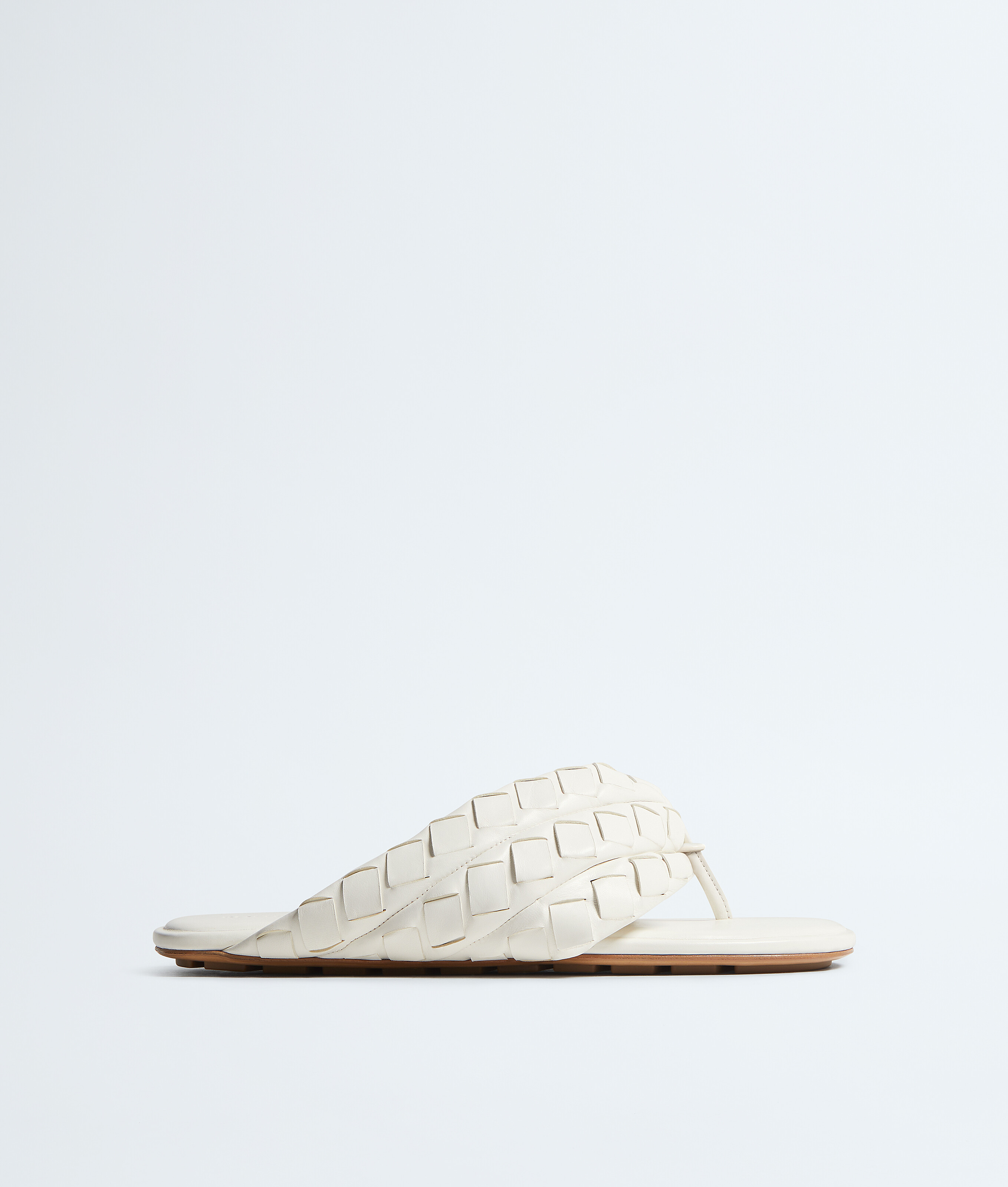 Tong plate en cuir nappa doux avec bride en cuir Intrecciato matelassé.