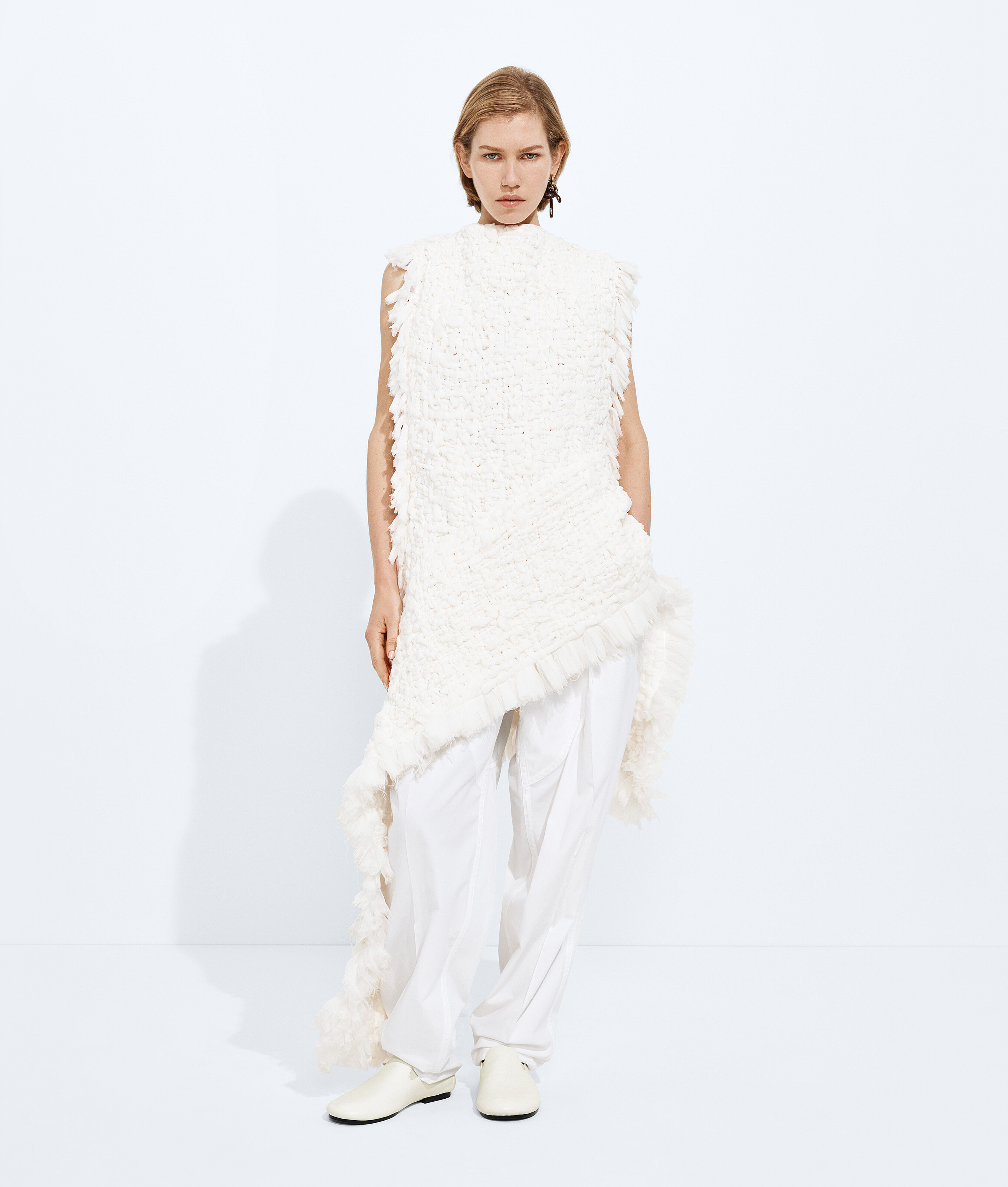 Haut à dos nu et silhouette asymétrique en mousseline de soie tressée Intrecciato à la main.